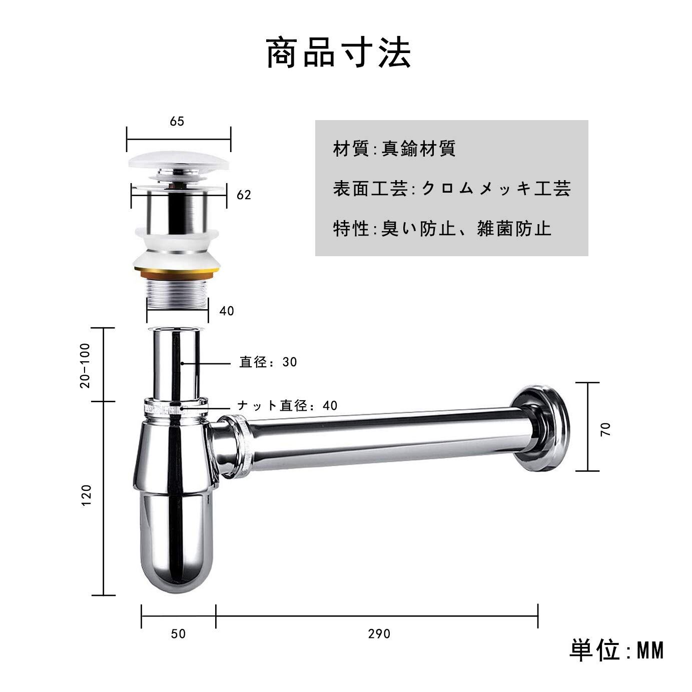 【排水金具】こちらのプッシュ式の排水栓は洗練されたクロム色の高級黄銅素材で作られています。それに環境に優しい材質を使用して、耐腐食性、耐熱性、非毒性、抗酸化性等いくつかな特性を備えています。<br> 「お買い得のセット」<br> セットには、4つの商品があります。<br> その一、便利に取り付けられる小型洗面ボウル<br> その二、シンプル、モダンな外観をしている蛇口<br> その三、とても便利なプッシュ式の排水栓<br> その四、底から簡単に取り外られるPトラップ