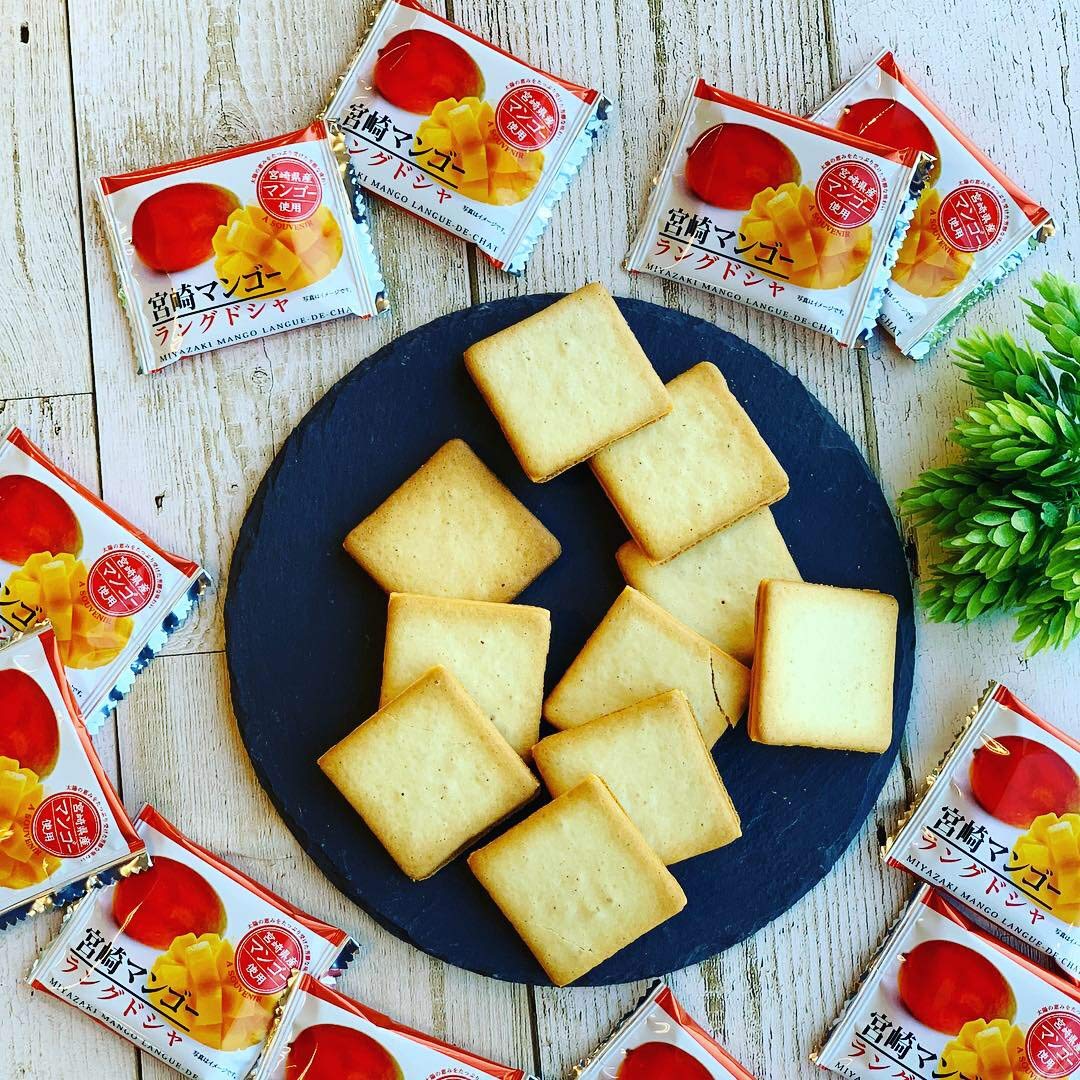 宮崎県産マンゴーで作ったマンゴージャムを生地に練りこんで仕上げたサクサクのラングドシャで、マンゴーチョコレートをサンドしたお菓子です。