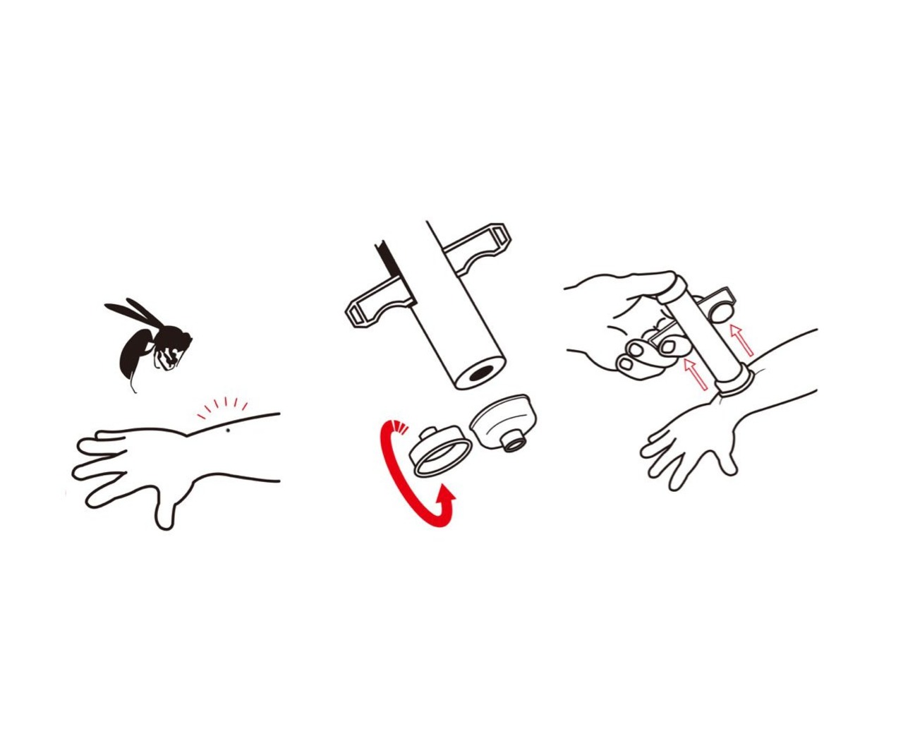 刺された部分にマウスピースを当て、吸引作用で毒液や毒針を抽出します。傷口に応じてカップ両側のマウスピース面を差し替えて使用可能です。