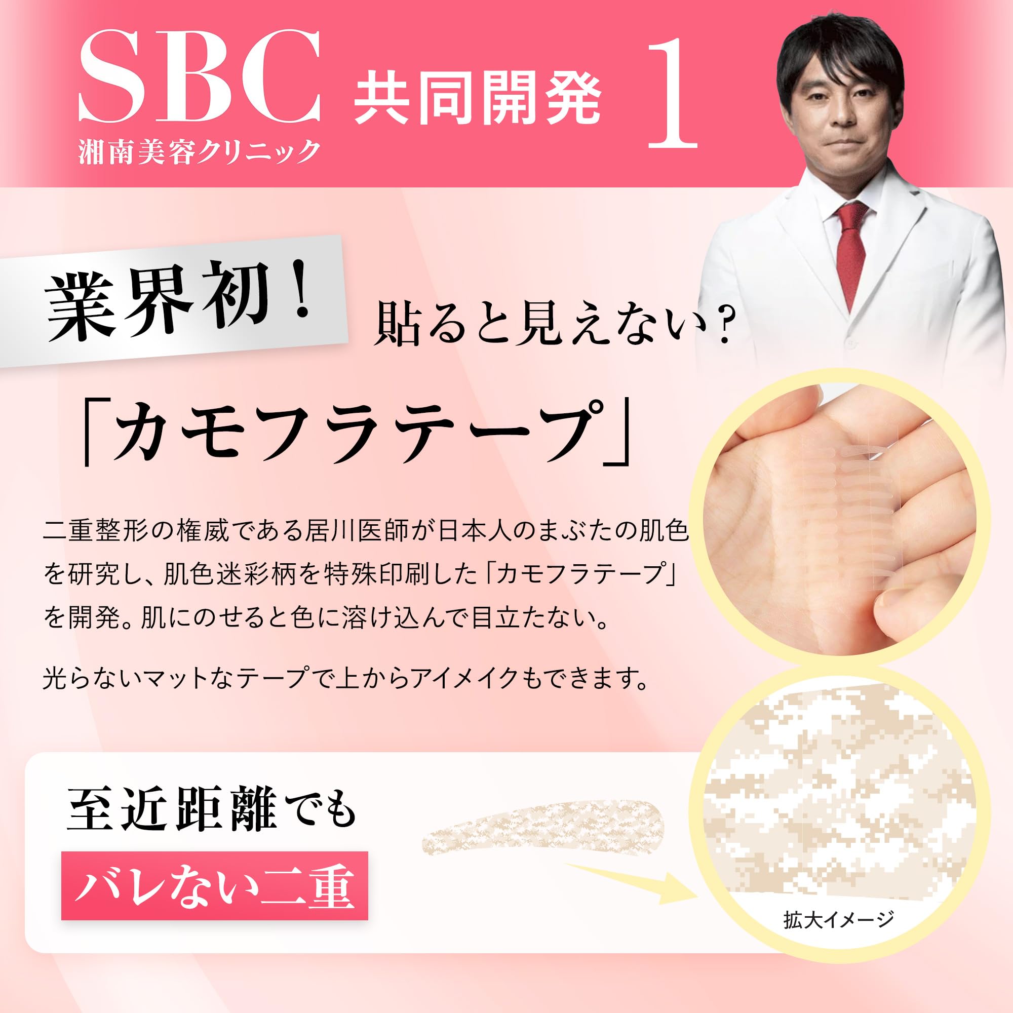 【画期的なカモフラテープ】:湘南美容アイリッドテープは、肌にのせると色に溶け込んで目立たなくなる肌色の迷彩柄「カモフラテープ」を採用しています。光らないマットなテープは上からアイメイクも可能で、寝ている間のふたえの癖付けもできます。