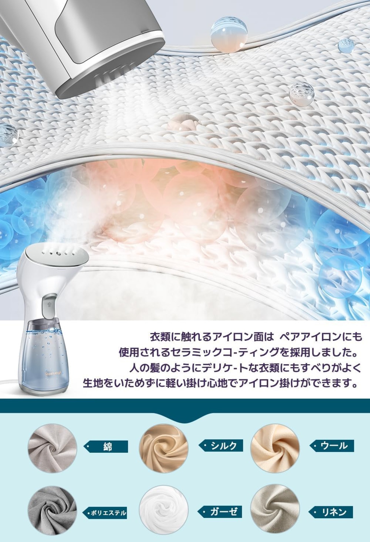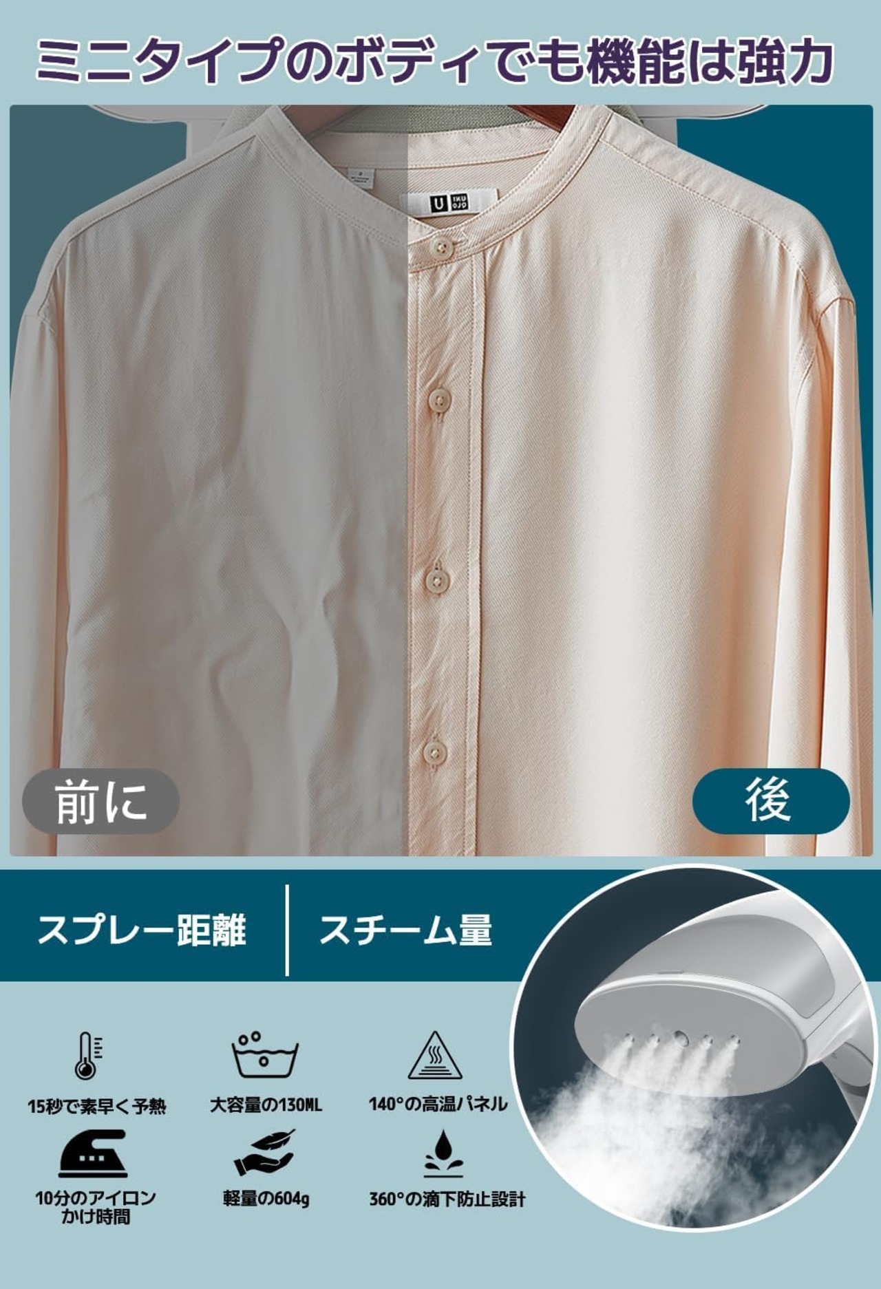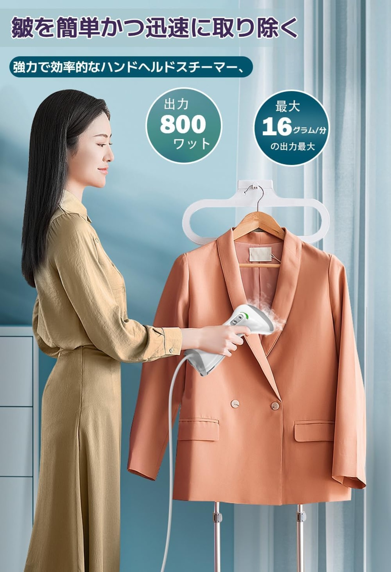 強力/超高速加熱/大容量:20秒で素早く予熱でき、800Wの高出力、16g/分の蒸気を強力かつ均一に注入し、衣類の奥深くまで素早く浸透させ、しわを取り除きます。取り外し可能な130mlの大容量水タンクを装備しているため、20分間継続して蒸気を供給できます。衣類から不健康な物質やしわを素早く効果的に取り除きます。