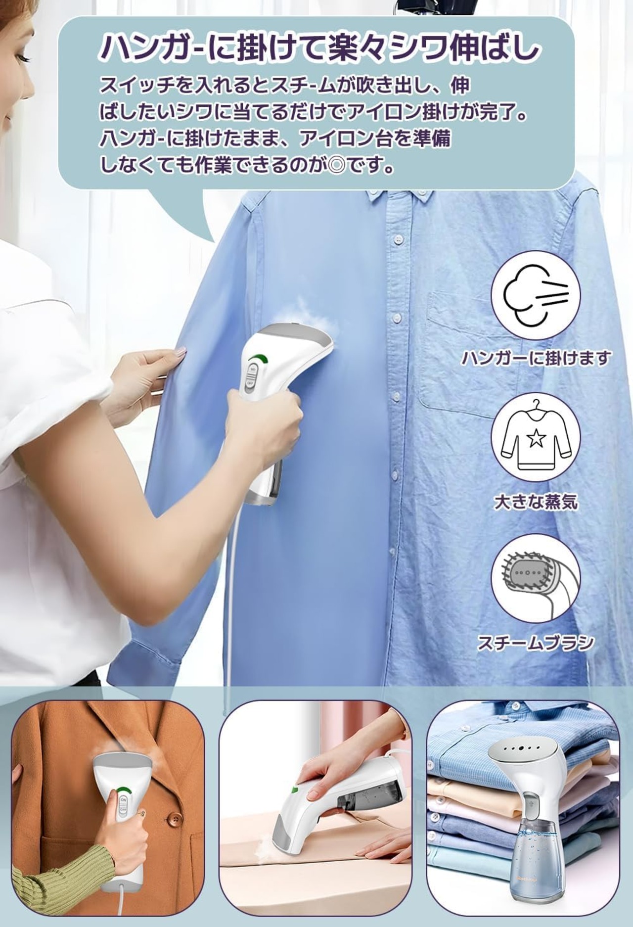 Raelunyi スチームアイロン アイロン 衣類スチーマー ハンガーにかけたまま シワ伸ばし 携帯アイロン 20秒立ち上がり パワフルスチーム 軽量 小型 ハンディアイロン 抗菌 消臭 時短 旅行/出張/家庭用 白
