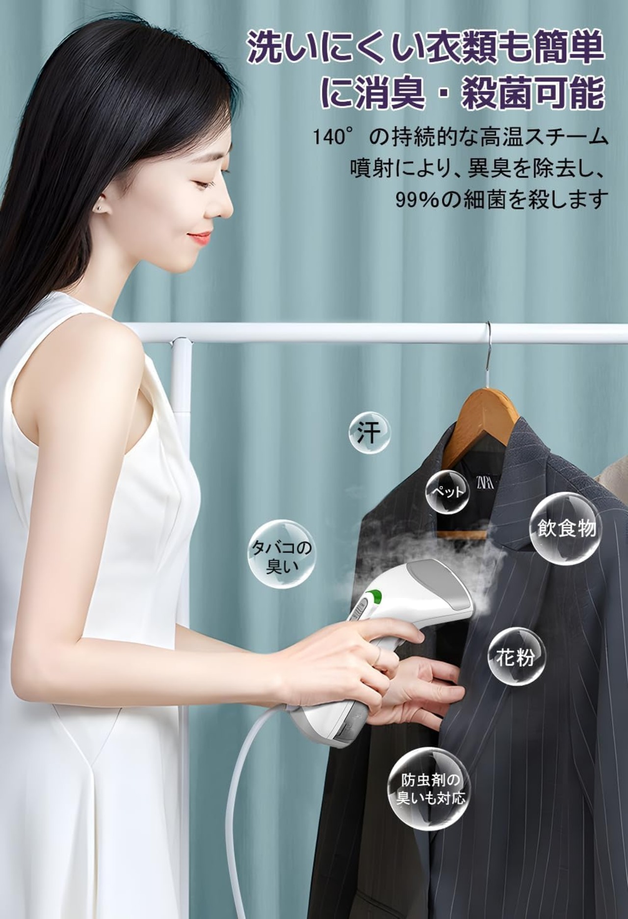 さまざまな生地の殺菌、脱臭に適しています:シルク、コットン、ウール、リネン、その他の生地などのあらゆる種類の衣類に使用でき、しわを簡単に取り除くことができます。繰り返し使用しても衣類を傷つけることはなく、衣類の質感を長持ちさせます。140°の高温で直接スチームすることで、除菌、煙や汗の臭さや、衣類に付着した虫や花粉を取り除くことができます。