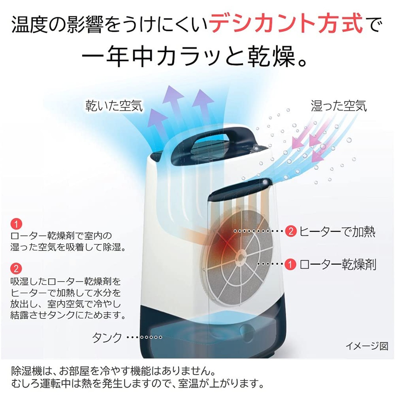 ●タンク容量約2.5L●除湿能力5.6L/日●見やすい液晶表示部、大容量タンク●デシカント方式だから軽量で、使いたい場所へ持ち運びもラクラク。 コンパクトで場所を取らずに置けるから、家中で使えて便利。 また花粉の気になる春、ジメジメした梅雨時期、夕立が心配な夏、長雨の秋、雪が降る寒い冬も衣類乾燥でオールシーズン部屋干しに役立ちます。