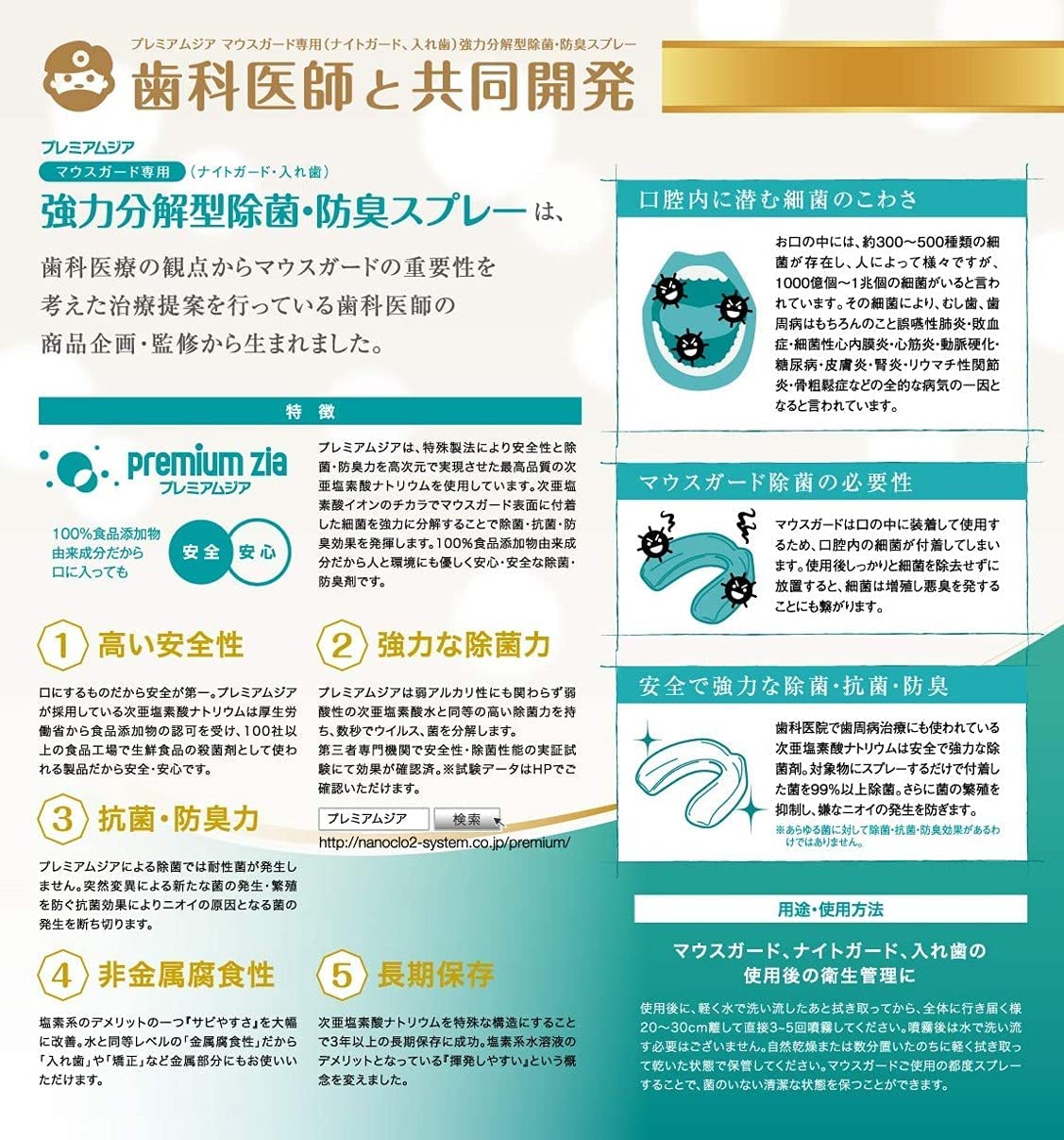 プレミアムジア マウスピース 歯科専売品 洗浄剤 マウスガード 入れ歯 除菌 アルコールフリー 消臭 ウイルス・菌の不活化 食品添加物由来 非金属腐食性 非漂白性 マウスガード専用スプレー 100ml×6本