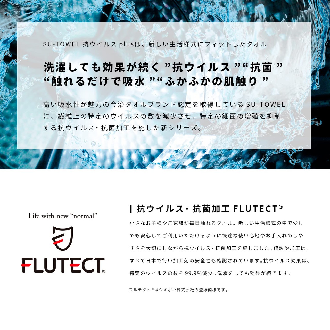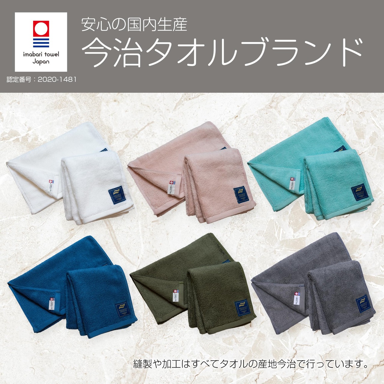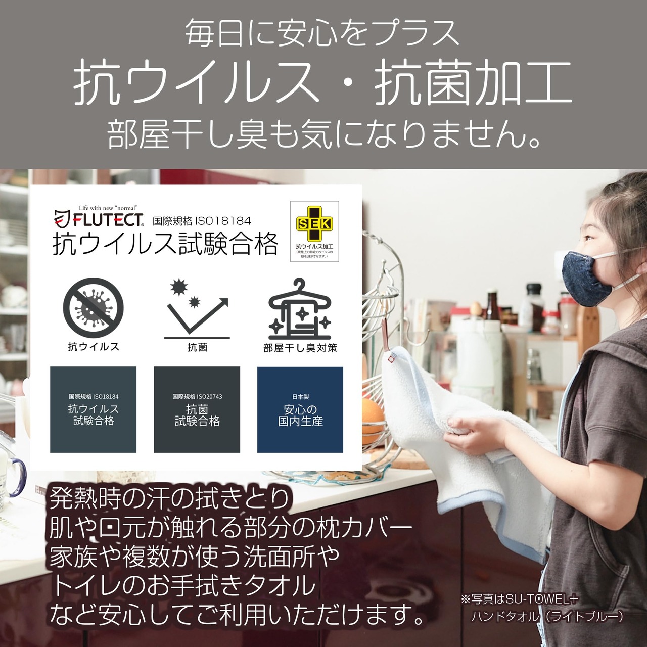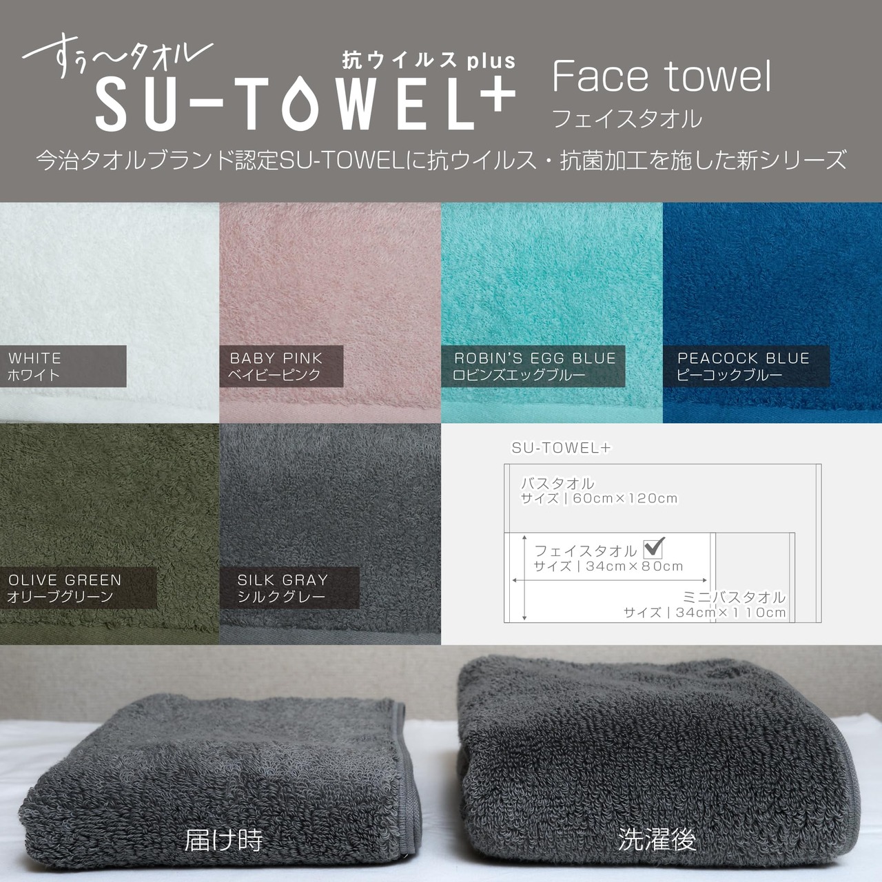 SU-TOWEL+は、今治タオルマーク認定を取得したSU-TOWELに、洗っても効果が続く抗ウイルス・抗菌加工をプラスしたタオルシリーズ。縫製や加工はすべて日本で行い、加工剤の安全性も確認されています。※洗濯後は、ぱたぱたと少し振ってパイルを立たせてから干すと乾きやすく、ふかふかしたボリュームが長続きします。