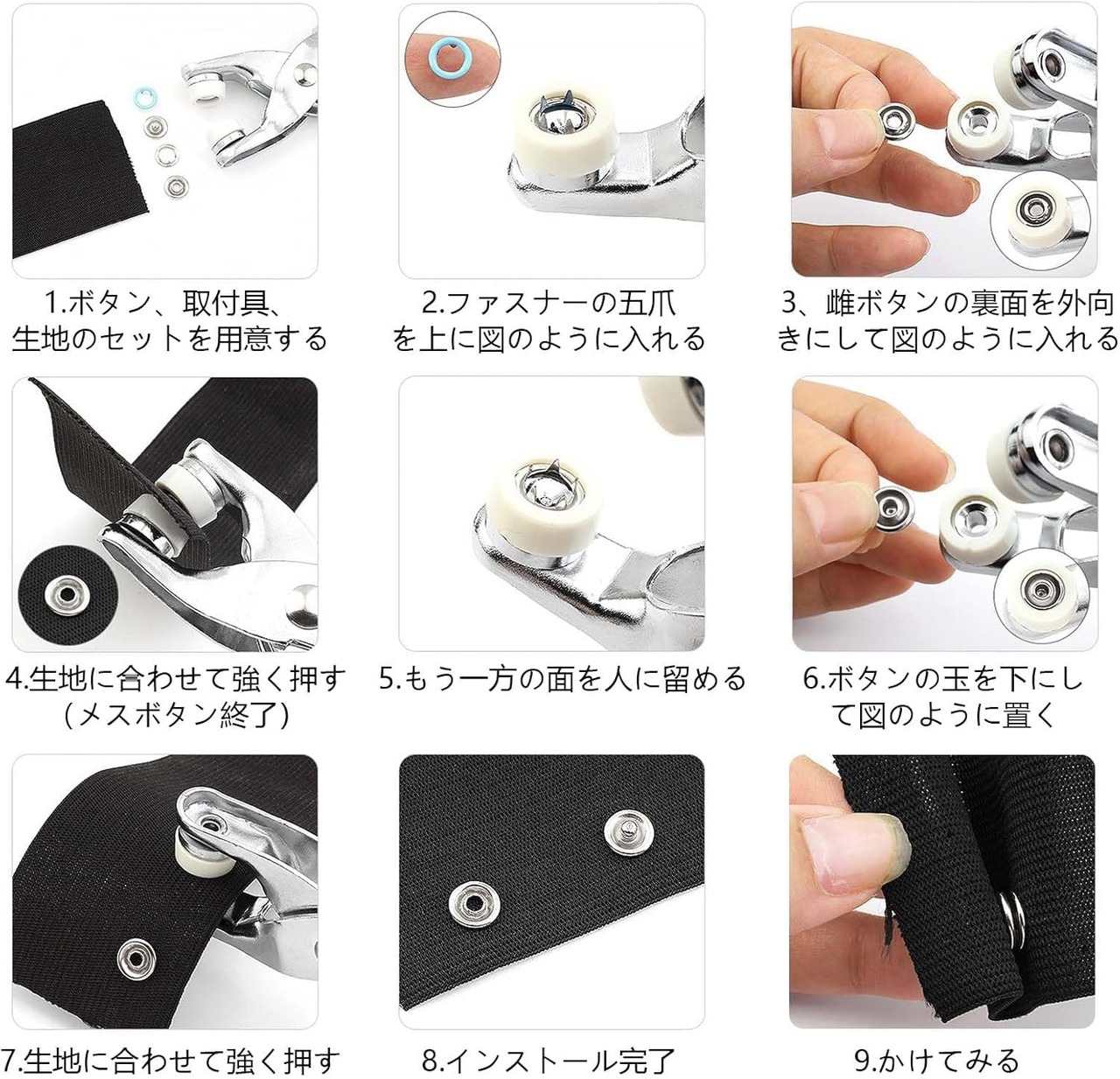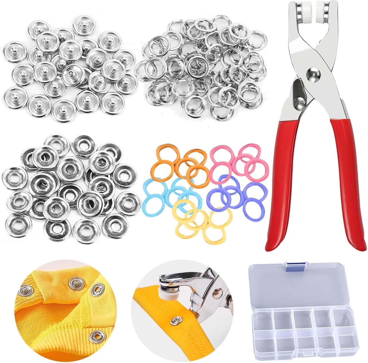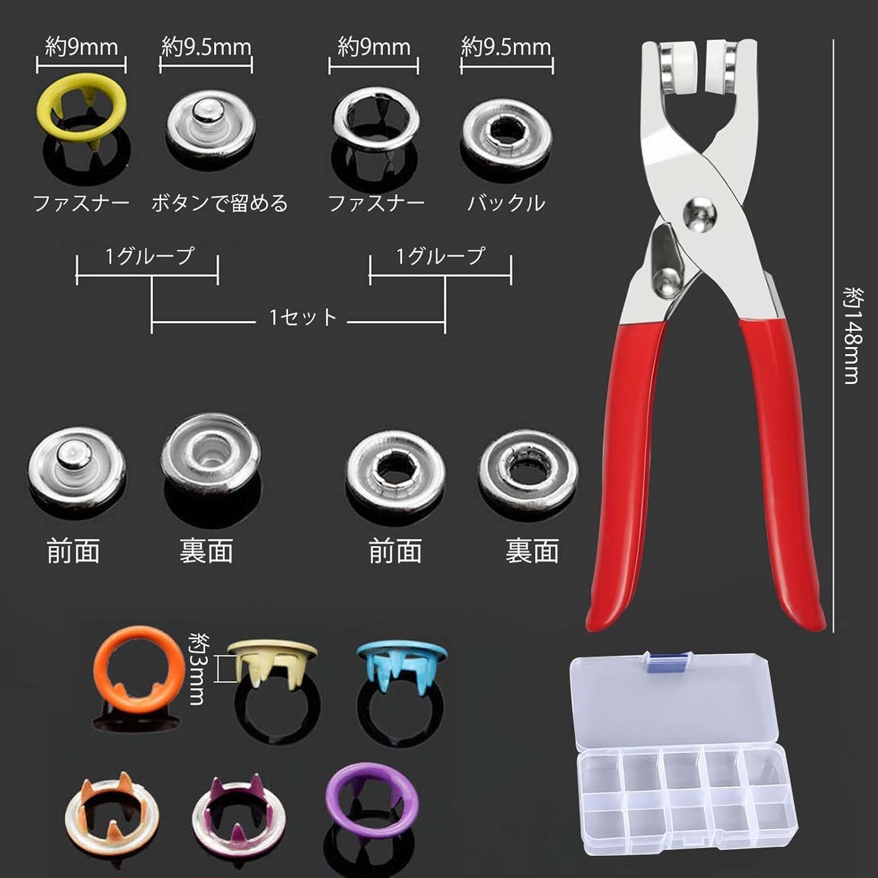 【梱包】金属スナップボタン が1箱届きます,全部で100個、大きさは約9MMです,金属ペンチと非常に便利な収納ボックスが付属しており、完全な付属品は、様々な美しい工芸品を作るために使用することができます。