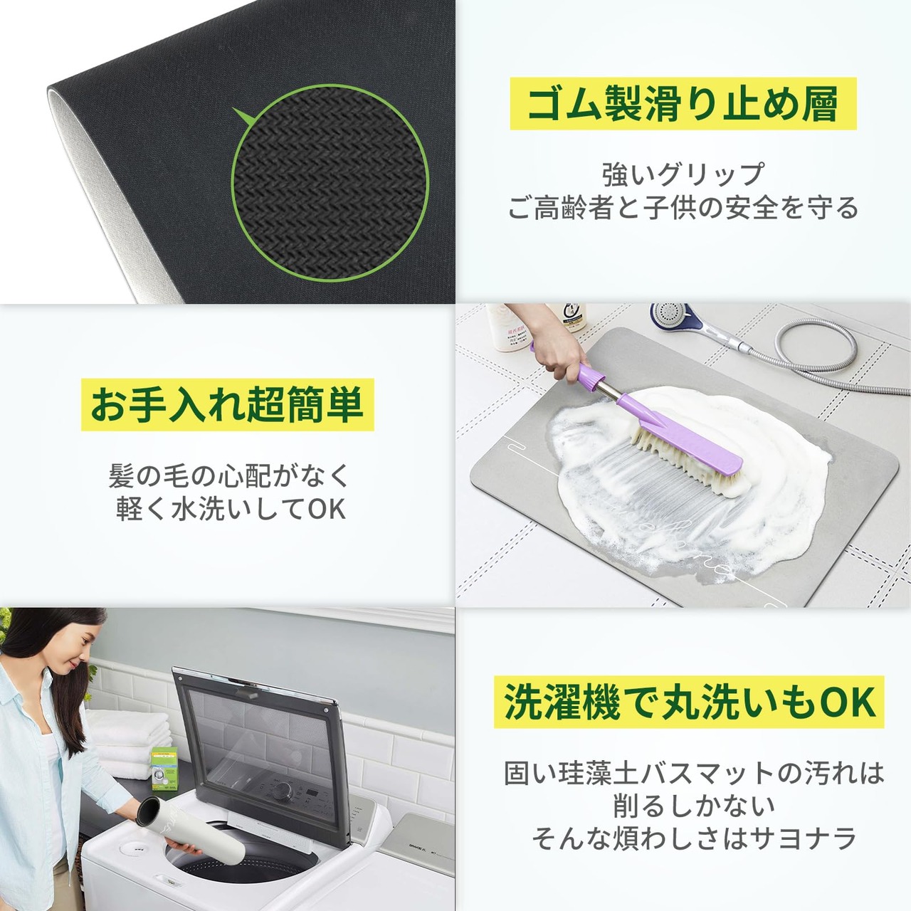 【タオル・硬いタイプと比べの長所】タオルタイプよりソフト珪藻土マットはお手入れ簡単、ホコリを溜めず、髪の毛を取り込まず、水を掛けながら軽くブラシで擦ればある程度キレイにはなります。抗菌、消臭、防カビ効果を実現します。硬いタイプよりソフト珪藻土バスマット一切割れず、冷たくない、カビを削る作業も不要です。