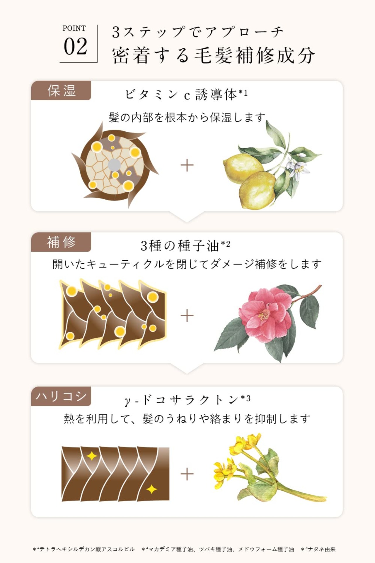 【 3ステップ 『保湿×補修×ハリコシ』 】密着する毛髪補修成分が3ステップでアプローチ!①髪の内部を根元から保湿します。 ②開いたキューティクルを閉じてダメージ補修します。 ③熱を利用して髪のうねりや絡まりを抑制します。