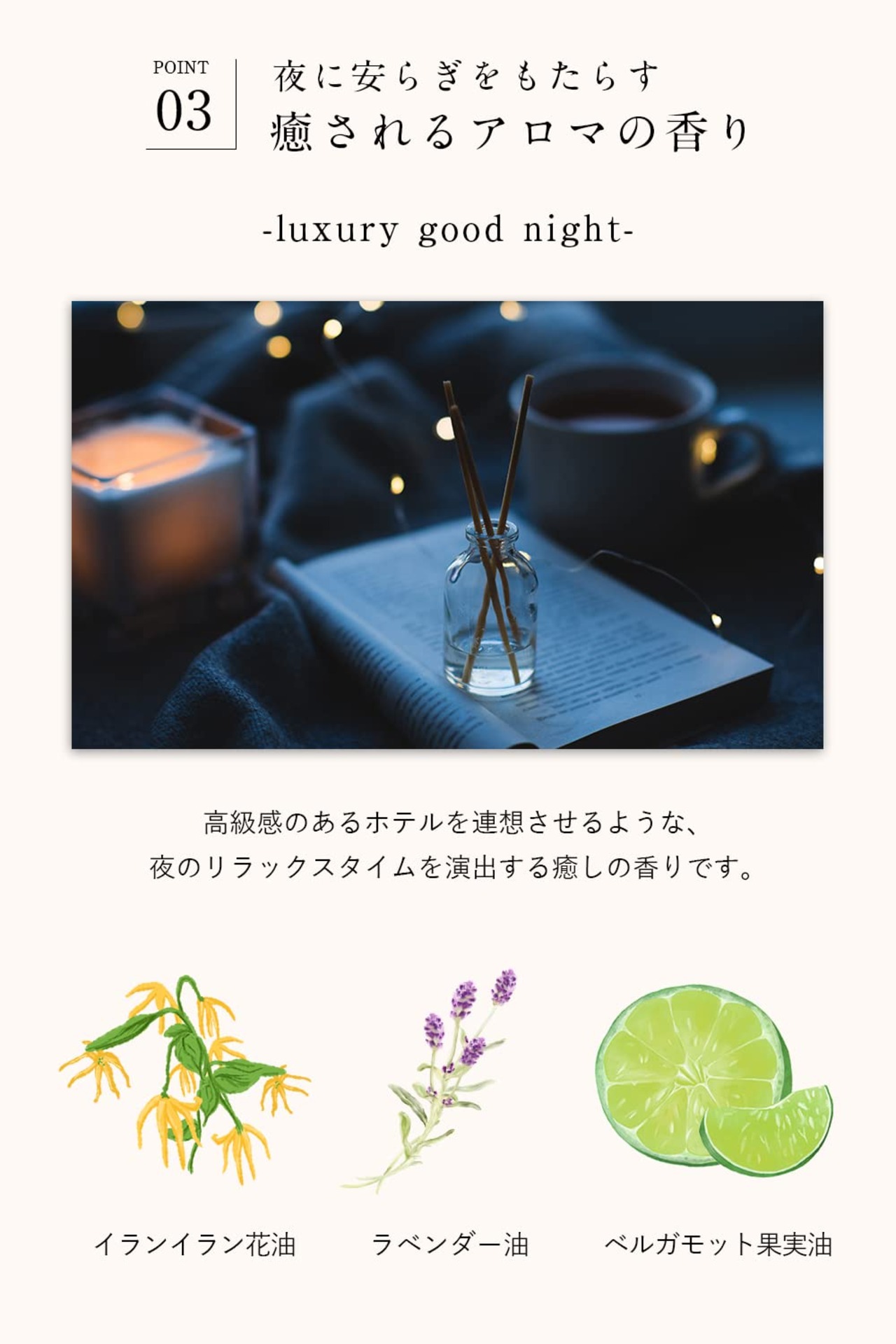 【 癒しの香り 『luxury good night』 】イランイラン × ラベンダー × ベルガモット 高級感のあるホテルを連想させるような香りです。癒されるアロマの香りで夜のリラックスタイムをお過ごしください。