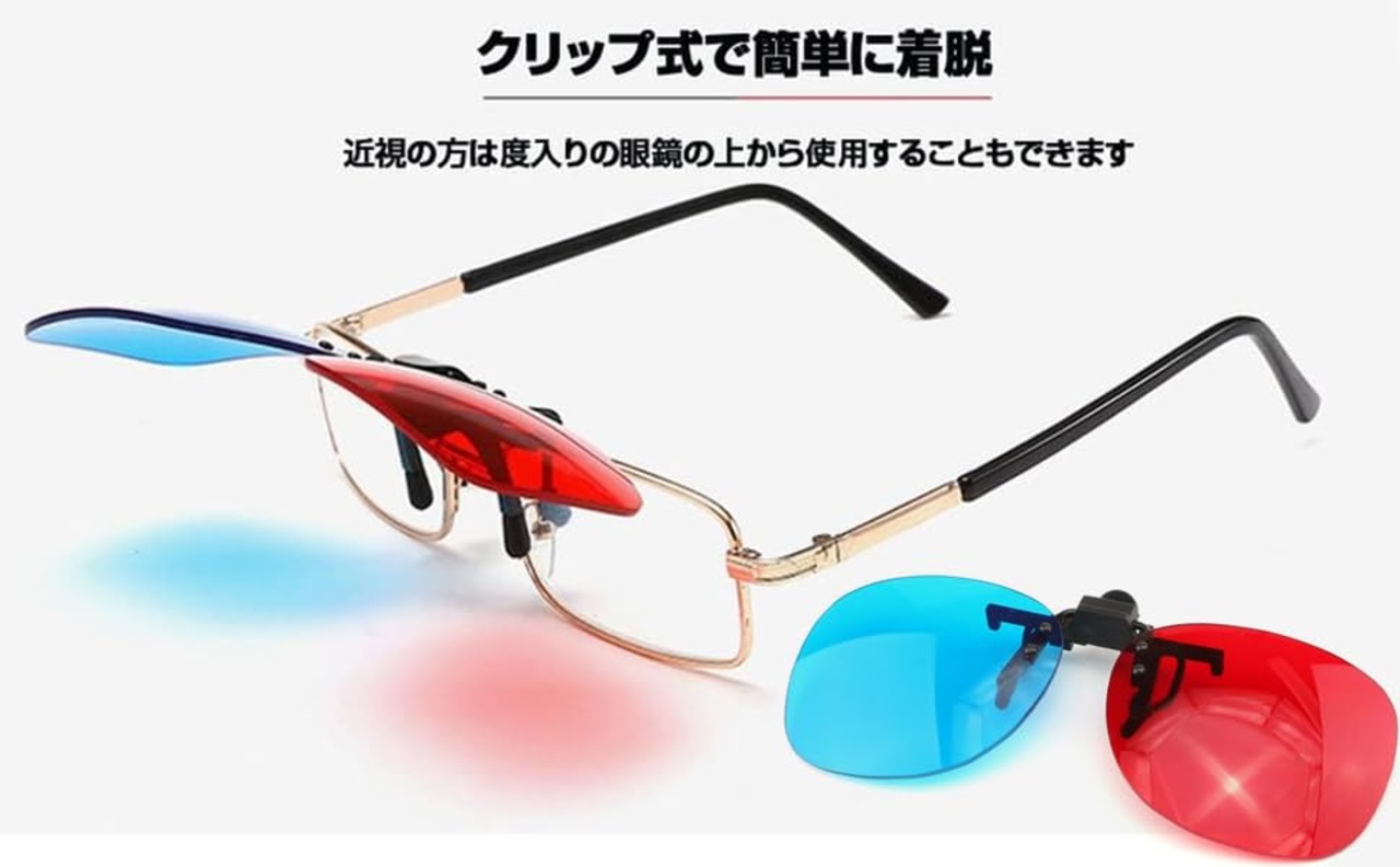 【基本情報】着用方法/クリップ;フレームなし;レンズ1色/赤;レンズ2色/青い