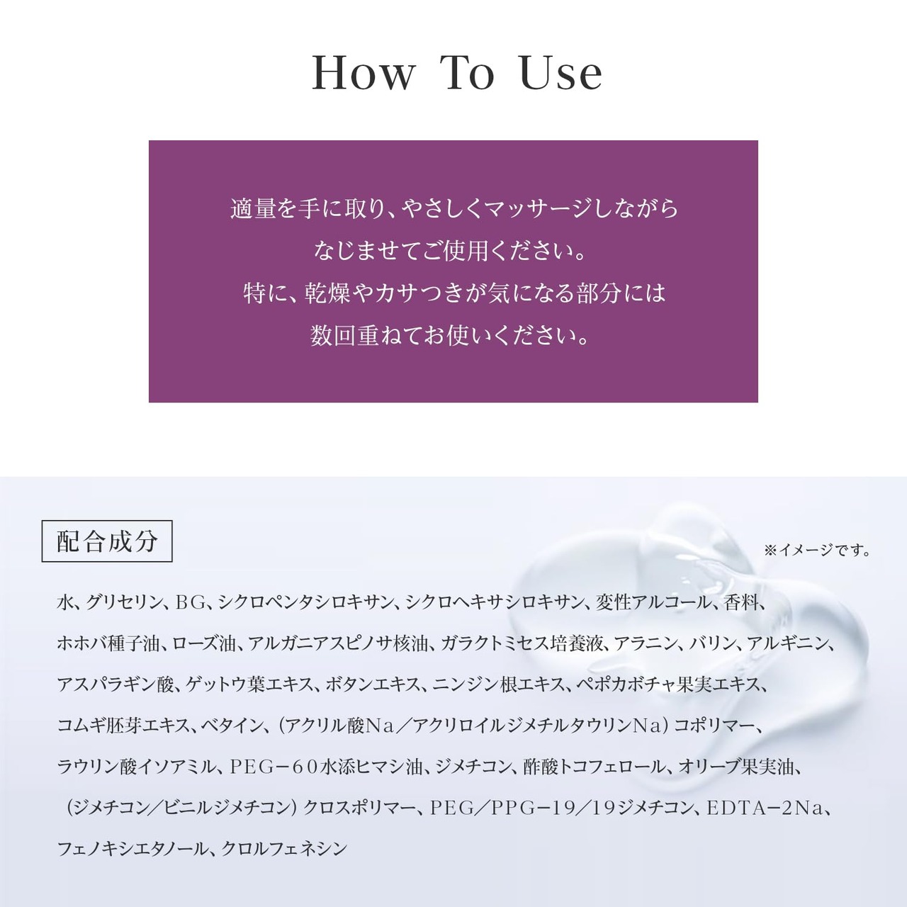 ・適量を手に取り、やさしくマッサージしながらなじませてご使用ください。