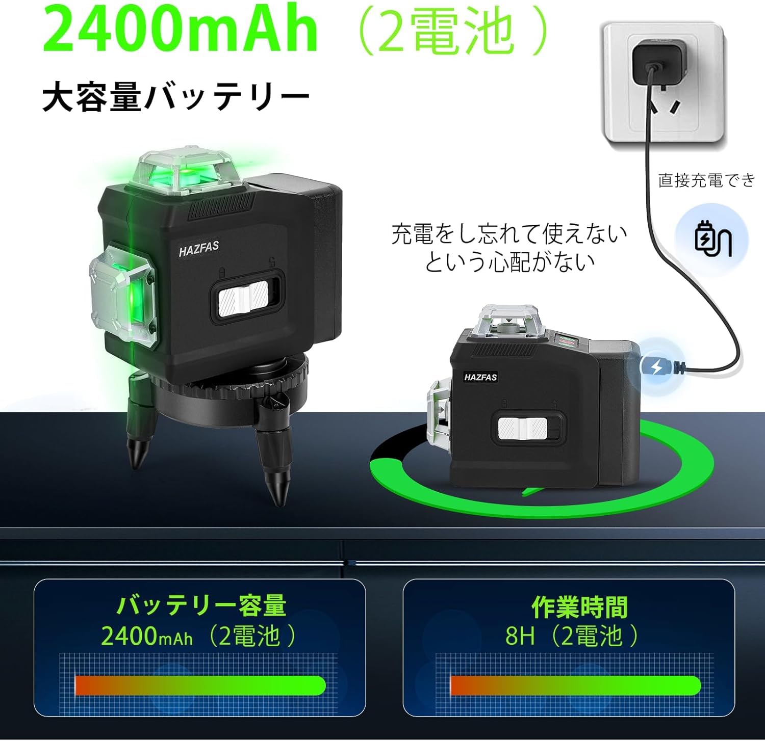 【長時間使用に対応する充電式バッテリー】2つの充電式バッテリーパックが付属しており、作業中でもバッテリーを交換することで長時間の使用が可能です。また、このレーザー墨出し器はL字型の支持台も付属しており、設置場所の微調整も簡単に行えます。屋内外を問わず、幅広い用途に対応したレーザー墨出し器です。