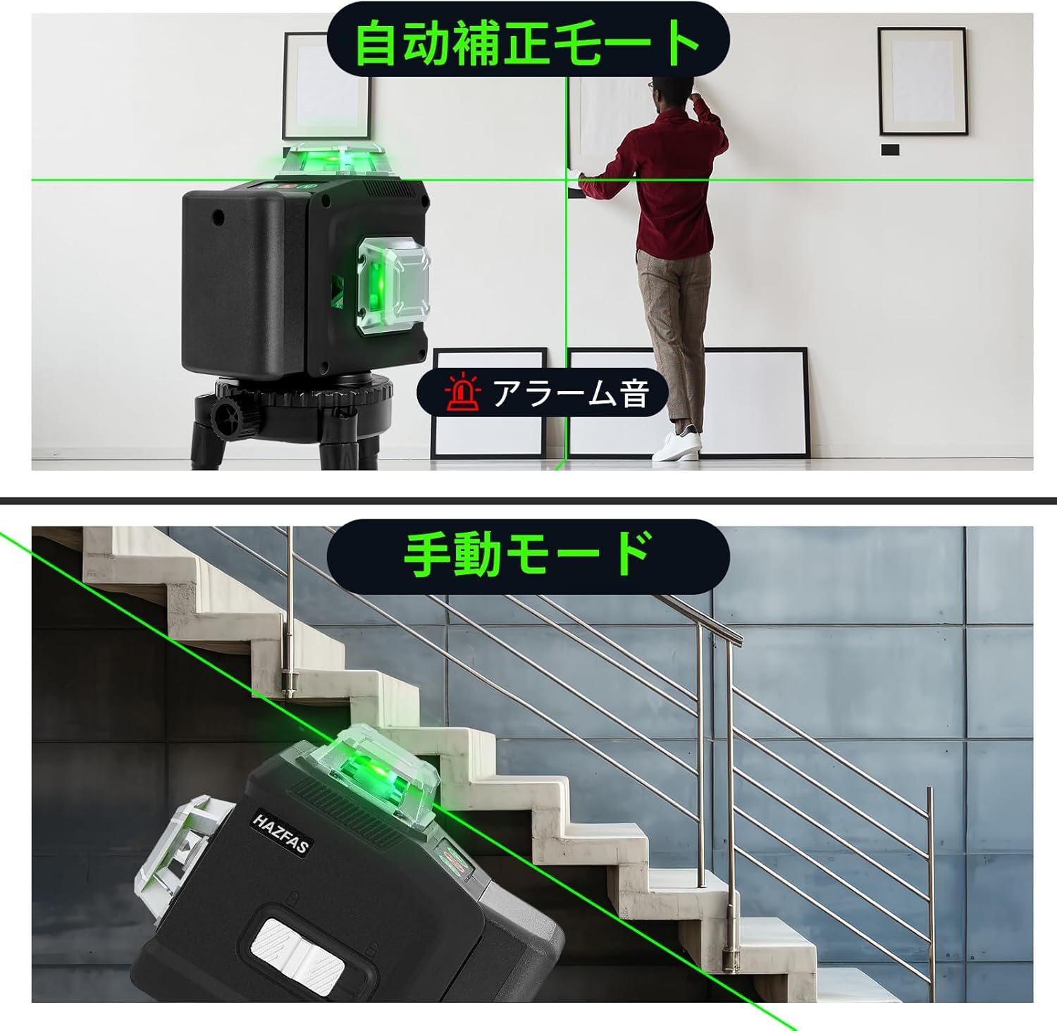 【自動水平補正と傾斜モードで便利】このレーザー墨出し器は自動水平補正機能を搭載し、±3°の範囲で自動的に水平調整が行えます。階段や傾いた面でも正確に使用できる傾斜モードを備えており、レーザー墨出し器はDIYや工事作業で非常に役立ちます。