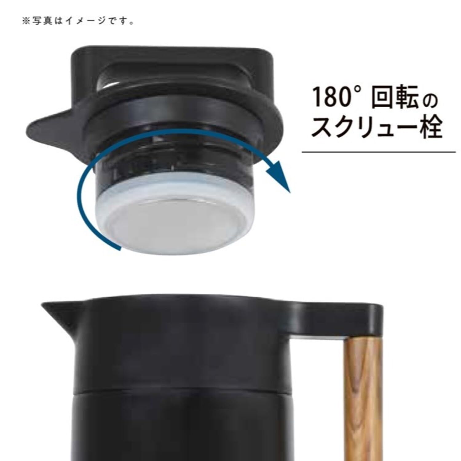品名:ステンレス製卓上用まほうびん、実容量:1.1L、保温効力:65度以上(10時間)、保冷効力:10度以下(10時間)、素材・材質:本体内側/18-8ステンレス鋼、本体外側/ステンレス鋼(アクリル樹脂塗装)、口がね・ハンドル/ポリプロピレン(耐熱温度100度・耐冷温度-20度)、ふた栓本体/ポリプロピレン(耐熱温度100度・耐冷温度-20度)、ふた栓金属部/ステンレス鋼、ハンドルカバー・ふた持ち手カバー/ABS樹脂(耐熱温度80度・耐冷温度-20度)、パッキン/シリコーンゴム(耐熱温度180度・耐冷温度-20度)