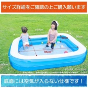 【空気入れも簡単!使用方法】(1)プールを広げ空気水口から空気を入れる (2)空気が9割程度入ったら空気口を閉じる (3)水を7分目辺りまで入れたら完成 ※ お持ちのレジャーシートをプールの下に敷いて使用するとより安全です。【使用後】※水栓から排水し、換気のいい場所でよく乾かす ※空気を抜く際は空気口を指でつまみながら本体を軽く押します。※空気入れは別売りですのでご注意ください。