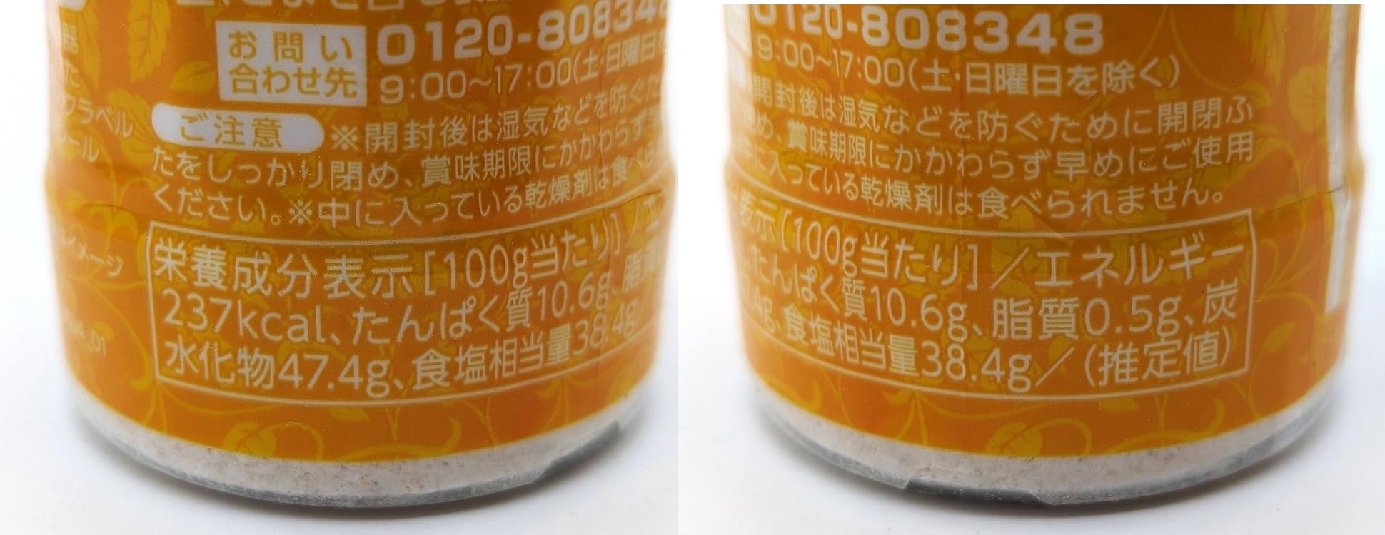 <バターしょうゆ風>栄養成分: 100g当たり ●エネルギー:202kcal ●たんぱく質:6.0g ●脂質:1.1g ●炭水化物:42.0g ●食塩相当量:48.4g<コンソメ味>栄養成分: 100g当たり ●エネルギー:237kcal ●たんぱく質:10.6g ●脂質:0.5g ●炭水化物:47.4g ●食塩相当量:38.4g