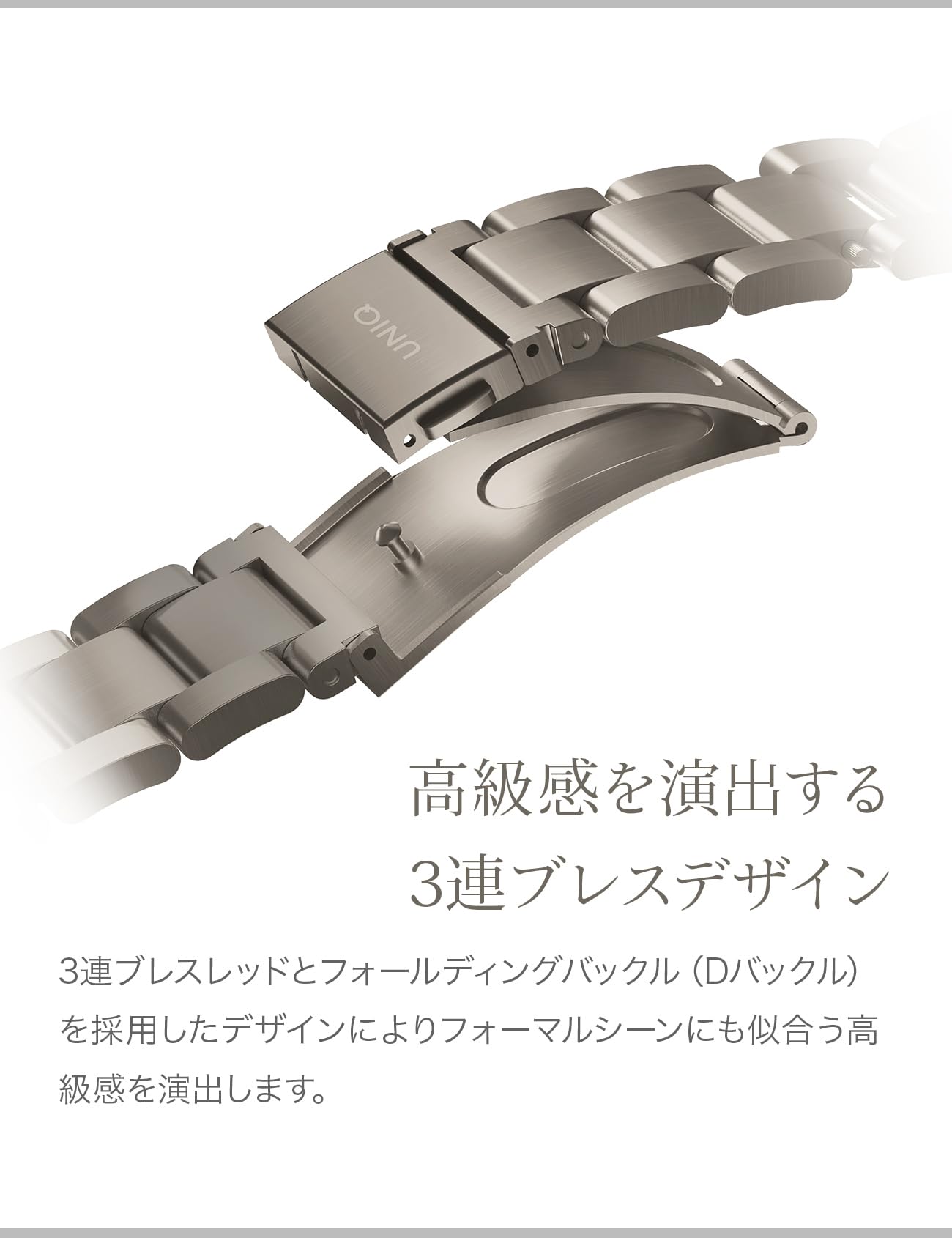 【贅沢な仕上げ】表面には高級時計に施される『サテン仕上げ』と『ポリッシュ仕上げ』を組み合わせて、贅沢に仕上げております。これにより、傷、へこみ、指紋がつきにくく、高級感溢れる美しい質感を実現しました。 3連ブレスレッドとフォールディングバックル(Dバックル)を採用したデザインによりフォーマルシーンにも似合う高級感を演出します。