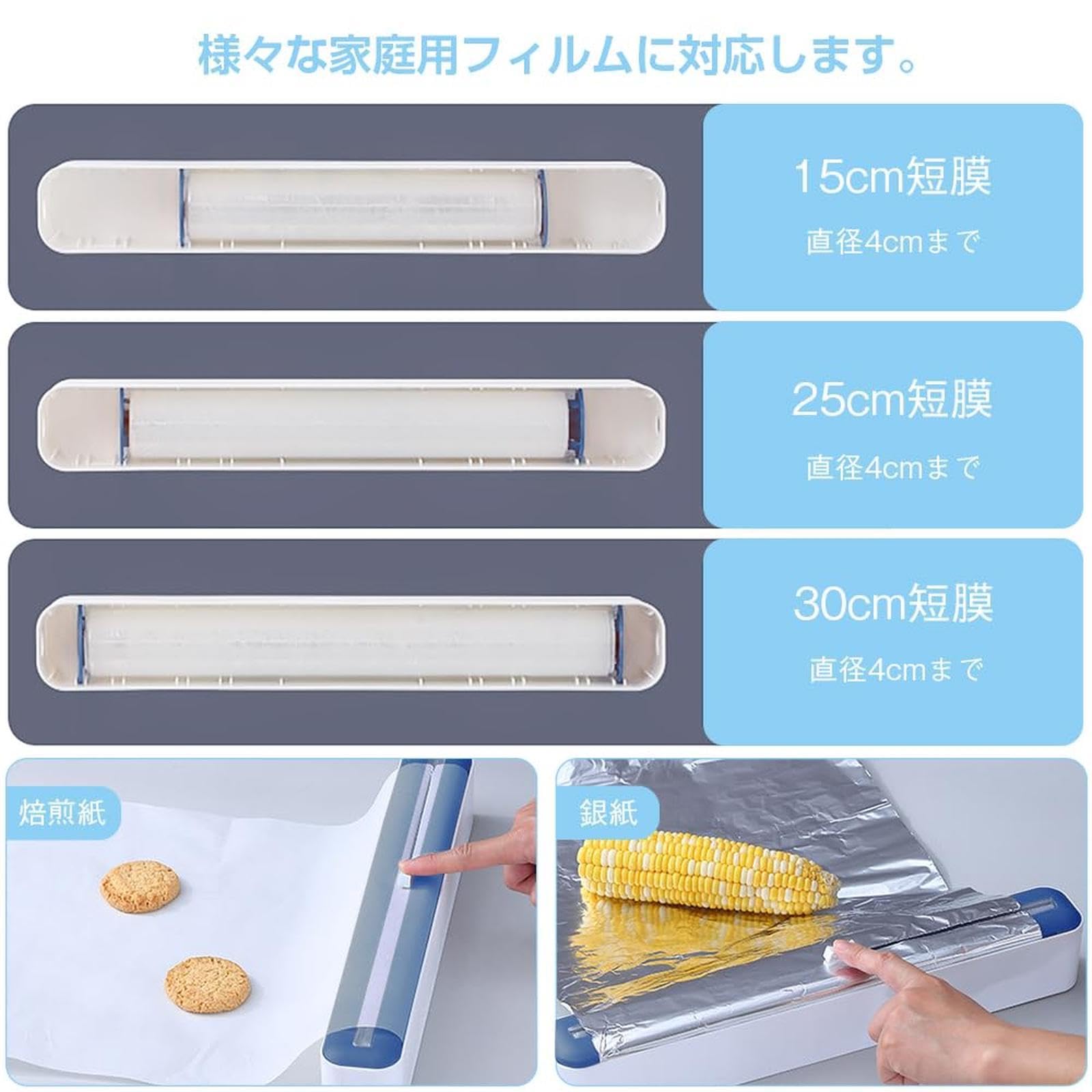 【双方向スライディングカッター】:当社の製品には鋭利な刃が内蔵されており、軽く押したりスワイプするだけでラップを簡単にカットし、必要な長さにカットできます。