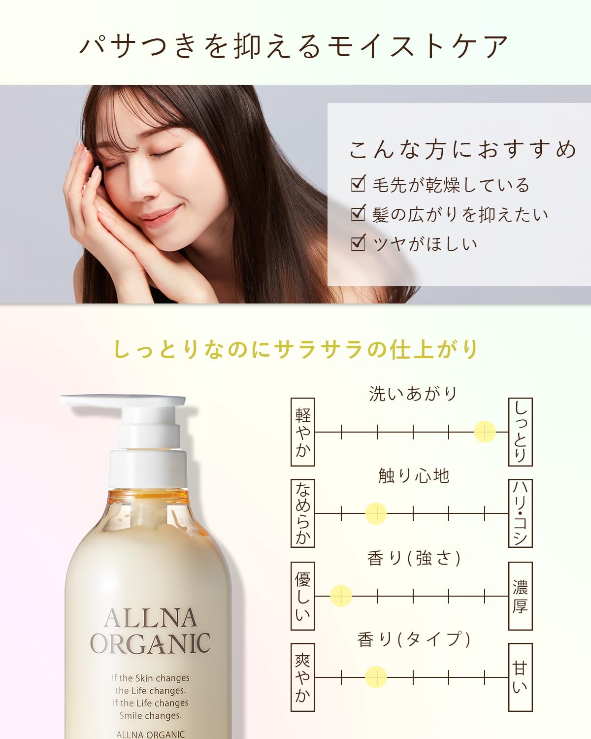 【 乾燥させないしっとり艶美髪 】大人気ALLNA ORGANICトリートメントの「パサつきを抑えたモイスチャータイプ」!広がらないまとまる髪へ導きます。