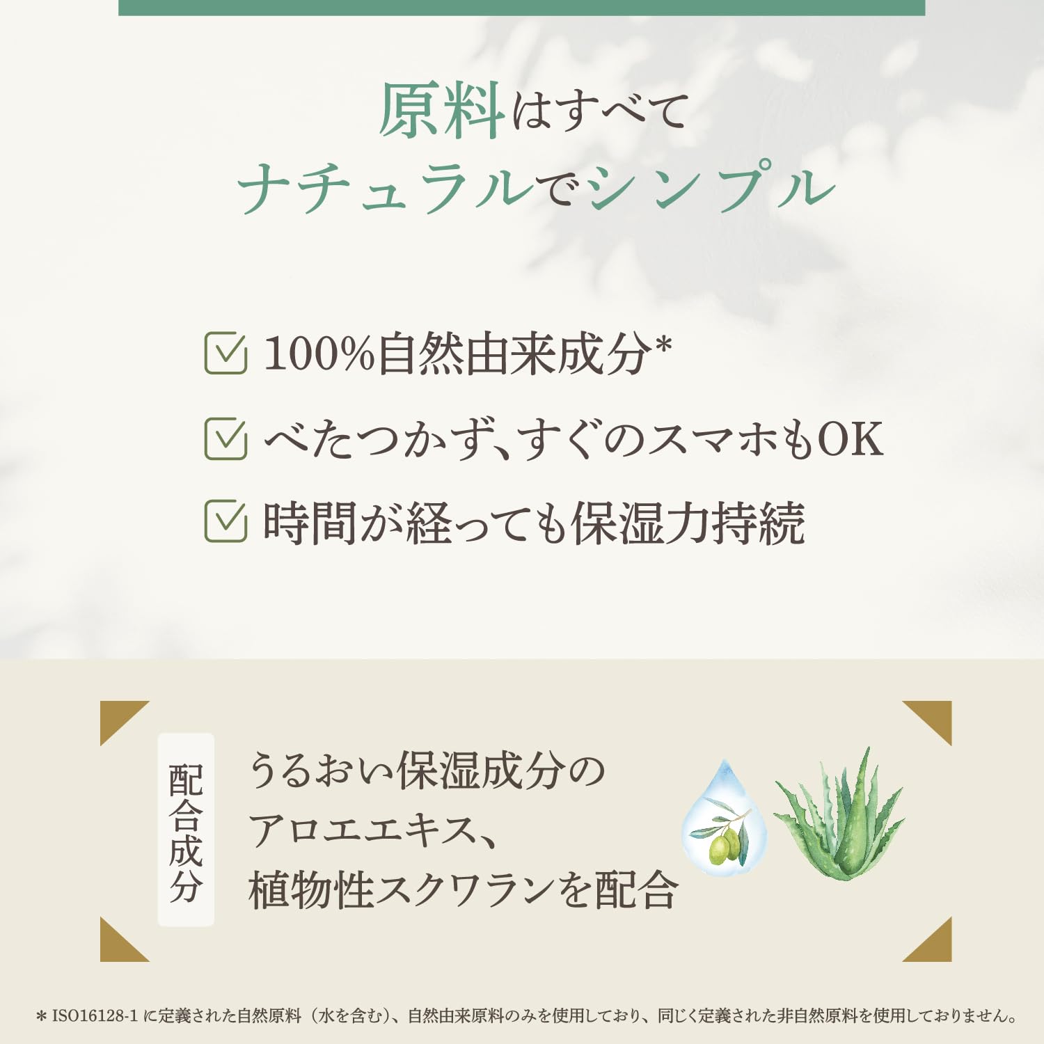 原材料:水、グリセリン、プロパンジオール、ホホバ種子油、スクワラン、ステアリン酸、パルミチン酸、カリ石ケン素地、ハイブリッドヒマワリ油、ベヘン酸、キダチアロエエキス-2、ベヘニルアルコール、トコフェロール、ヒノキチオール、エタノール