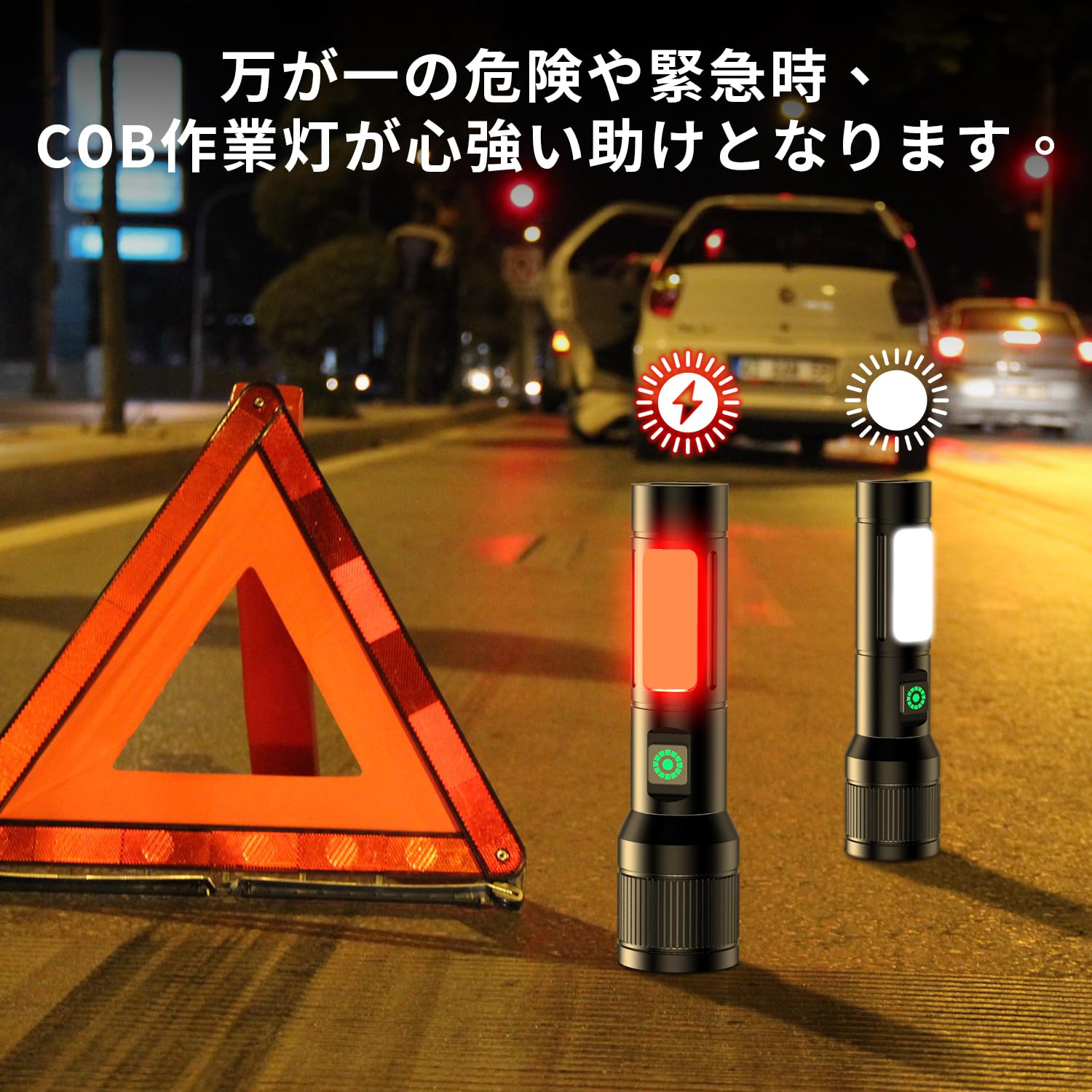 【高強度LED照明で&作業用COBライト&6つの多機能点灯モード】この懐中電灯は,高輝度の LEDを搭載し、最大1000ルーメンの明るさを実現、最大照射距離は500メートルに達します、投射された光束の明るさは完全に同じタイプの懐中電灯を超えて、緊急時にはCOB赤灯の点滅でSOS信号として使用でき、安全性を向上させます。懐中電灯のヘッドを伸縮させることで焦点距離を調整し、遠距離スポットライトまたは広範囲の汎光灯を自由に選択することが可能です。