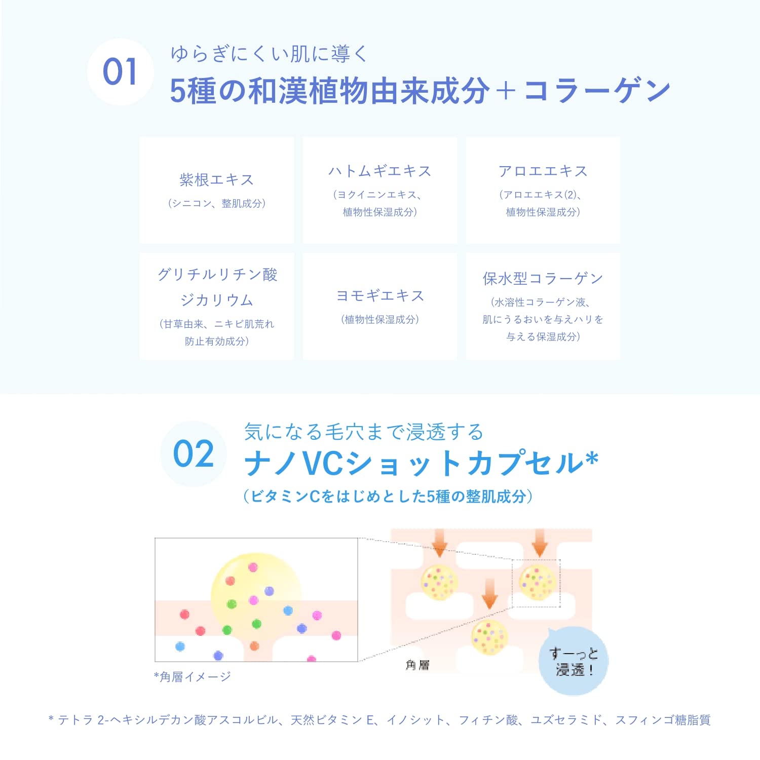 また、ビタミンC誘導体をはじめとした5種の整肌成分(*3)から成る「ナノVCショットカプセル」で、浸透力がアップ&毛穴をケア(*2)。みずみずしい清潔な垢抜け肌(*4)へ整えます。