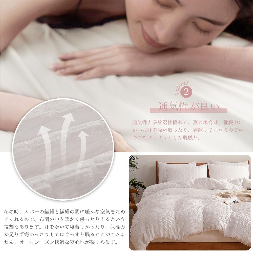 布団カバーセット シアサッカー生地 シングル ダブル 寝具カバーセット 3点セット 掛け布団カバー ボックスシーツ 枕カバー 可愛い 柔らかい 快適 通気性 速乾タイプ 丸洗い オールシーズ(ダブル4点セット、ホワイト)