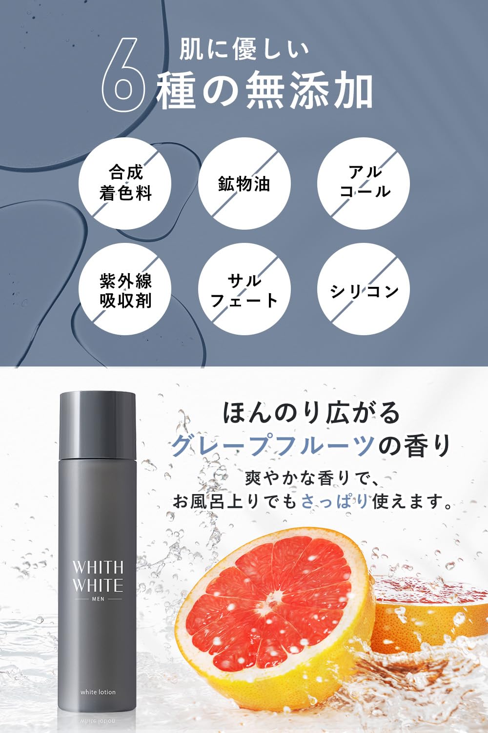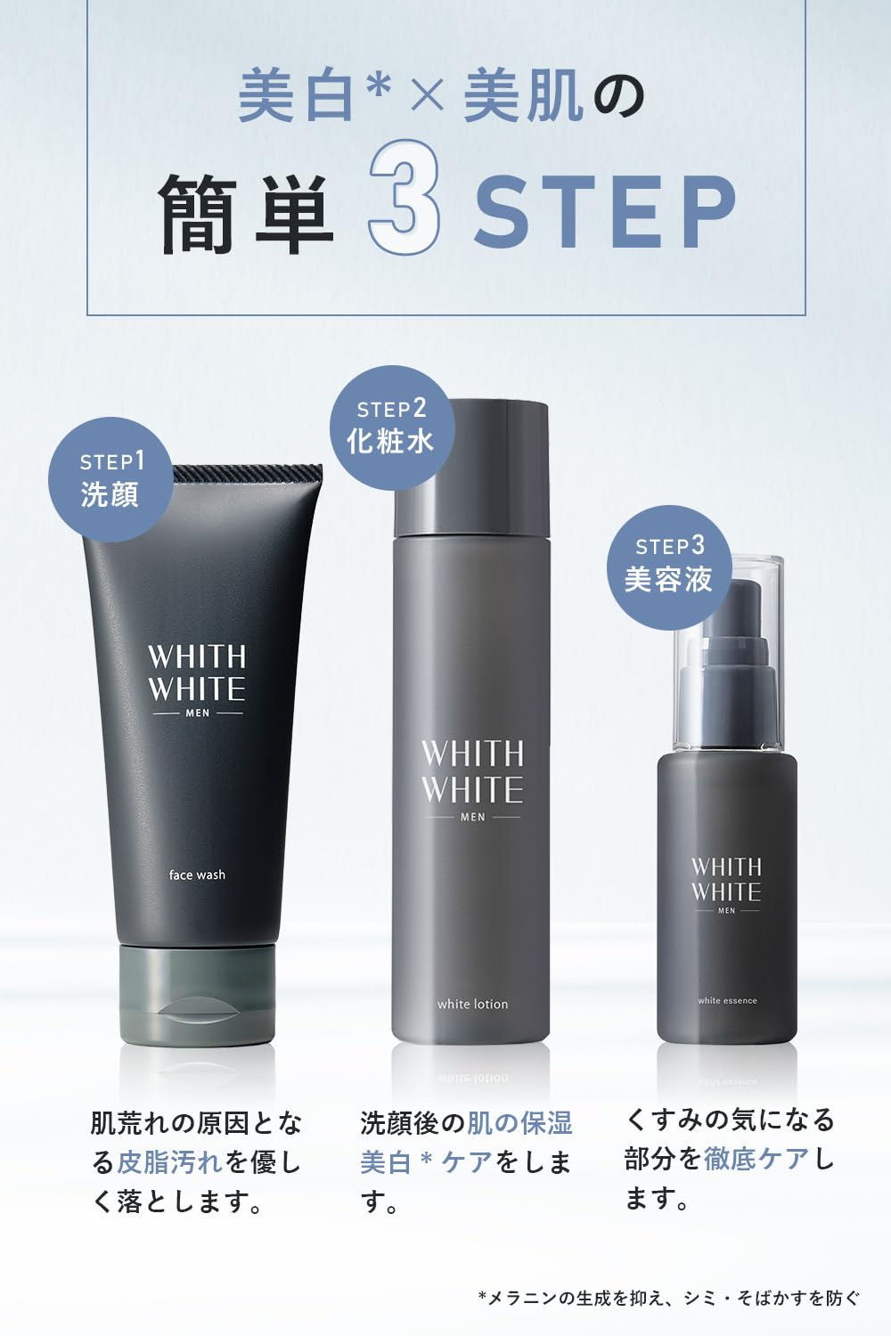 【使用方法 】洗顔後などお肌を清潔にした後、 化粧水 を適量手に取り、気になる部分になじませます。 WHITH WHITE MEN 美容液 を合わせて使用するとさらに 効果を引き立てることができます。