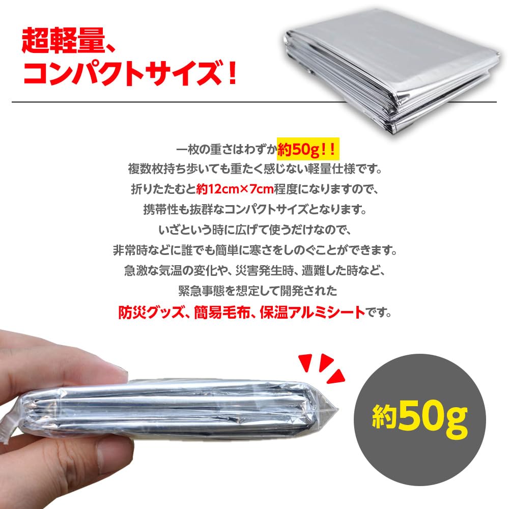 超軽量、コンパクトサイズ!:一枚の重さはわずか約50g!!複数枚持ち歩いても重たく感じない軽量仕様です。 いざという時に広げて使うだけなので、非常時などに誰でも簡単に寒さをしのぐことができます。 急激な気温の変化や、災害発生時、遭難した時など、緊急事態を想定して開発された防災グッズ、簡易毛布、保温アルミシートです