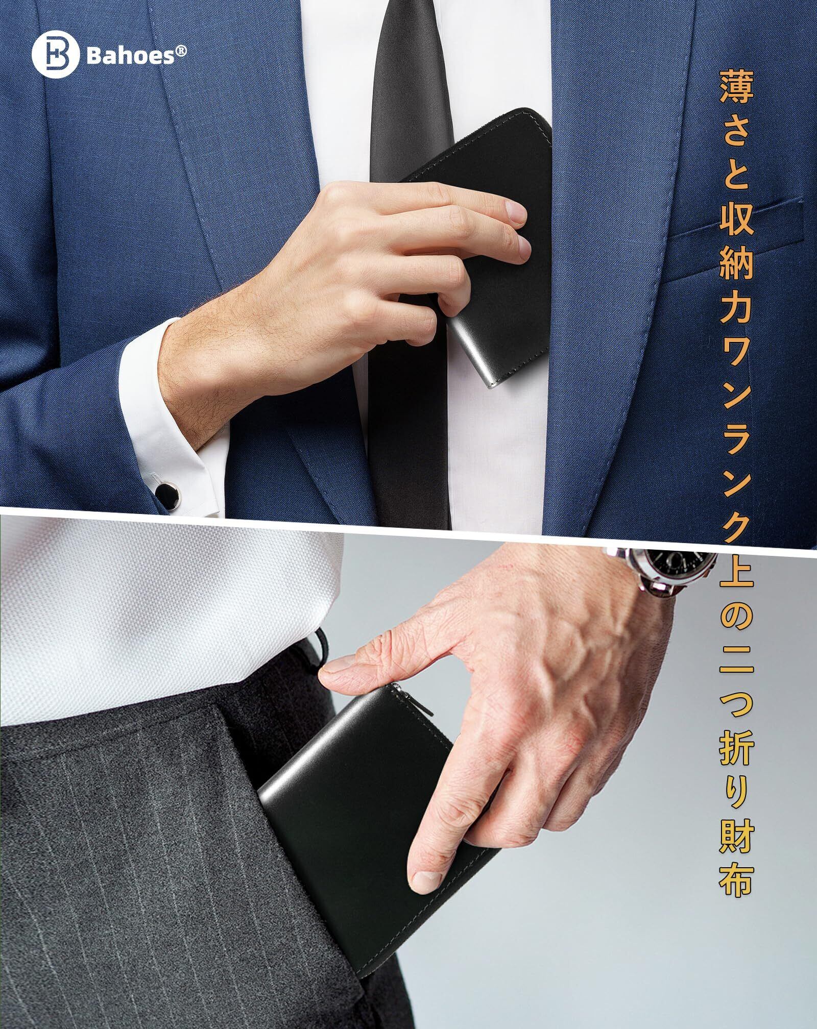 Bahoes 二つ折り財布 メンズ 栃木レザー 財布 メンズ 2つ折り コンパクト 薄いトチギレザー サイフ 本革 一流の職人が作る 新設計の折り財布 YKK ファスナー BOX型小銭入れ ミニ 薄く 小さく かさ張らない 人気ブランド 男性 紳士用 父の日(新モデル)