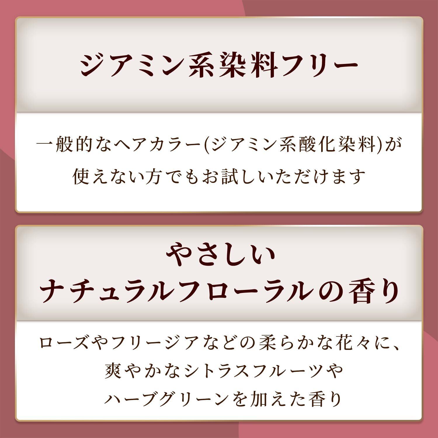 水、グリセリン、ステアリルアルコール、セタノール、ベヘントリモニウムクロリド、ジメチコン、ミネラルオイル、DPG、アルガニアスピノサ核油、オリーブ果実油、セトリモニウムクロリド、炭酸水素アンモニウム、ツバキ種子油、ヒドロキシエチルセルロース、フェノキシエタノール、香料、(+/-)2-アミノ-6-クロロ-4-ニトロフェノール、HC赤13、HC黄4、HC青2、HC青16、塩基性橙31