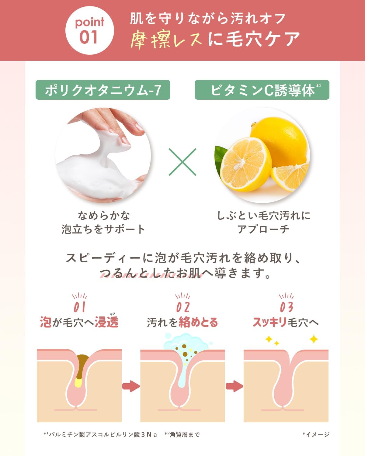 【 毛穴ケア 】泡が毛穴汚れを絡め取り、つるんとしたお肌へ導きます。ビタミンC誘導体(パルミチン酸アスコルビルリン酸3Na)を配合し、しぶとい毛穴汚れにアプローチします。