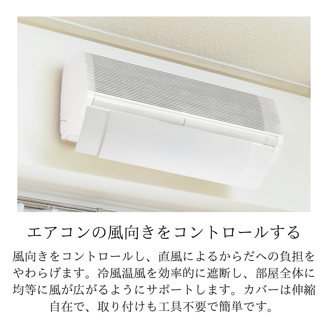 ● エアコン風よけカバーは、冷風や温風を効率よく遮断し、風向きをコントロールすることで、直風による体への負担を軽減します。これにより、快適な室温が維持しやすくなります。