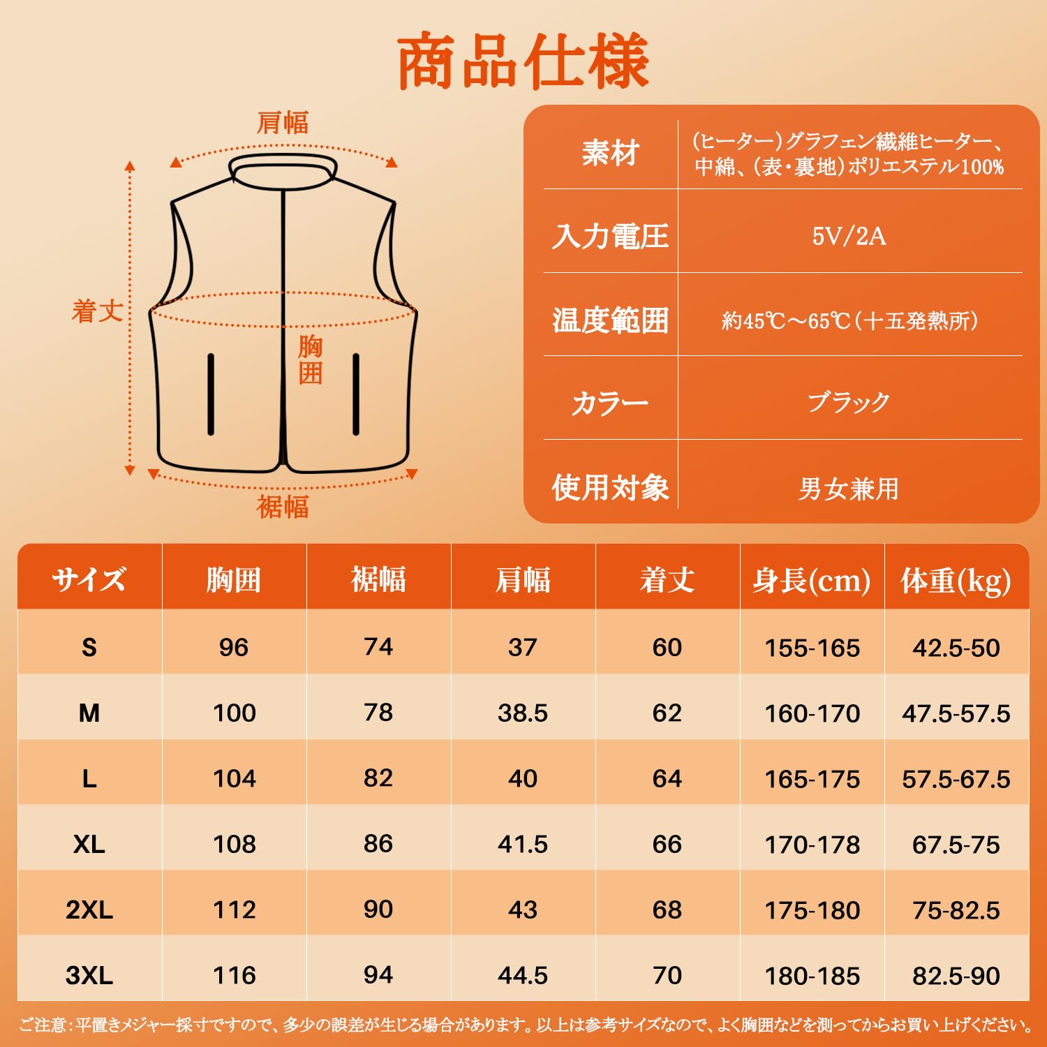 【USB給電 & 洗濯機で洗濯可能】USB加熱のヒーターベストはバッテリー接続用USBケーブルが付属しています。バッテリーと接続して使用します。(※ご注意:本製品はバッテリーが付属しておりません。手元の5V/2A以上のUSB出力を備えた充電式モバイルバッテリーを別途ご用意ください。)上質な軽量素材を使用し、手触りが柔らかくて、快適で着心地がとてもいいです。手洗いや洗濯機洗いやどちらでも可能です。(ご注意:洗濯機で洗う時、洗濯ネットをご使用くだいさい。)