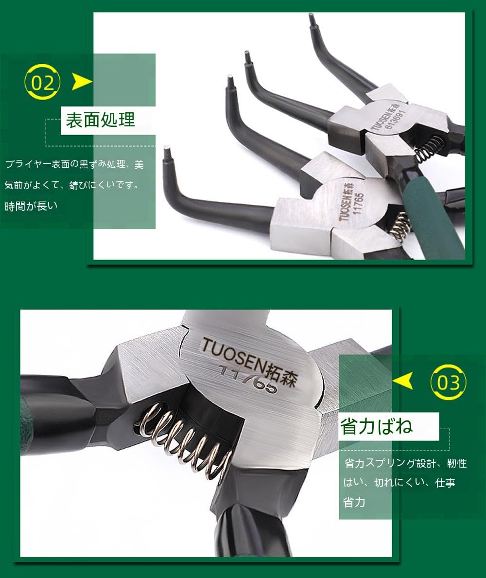 スナップリングプライヤー プライヤーセット サークリッププライヤー 穴・軸用 緑