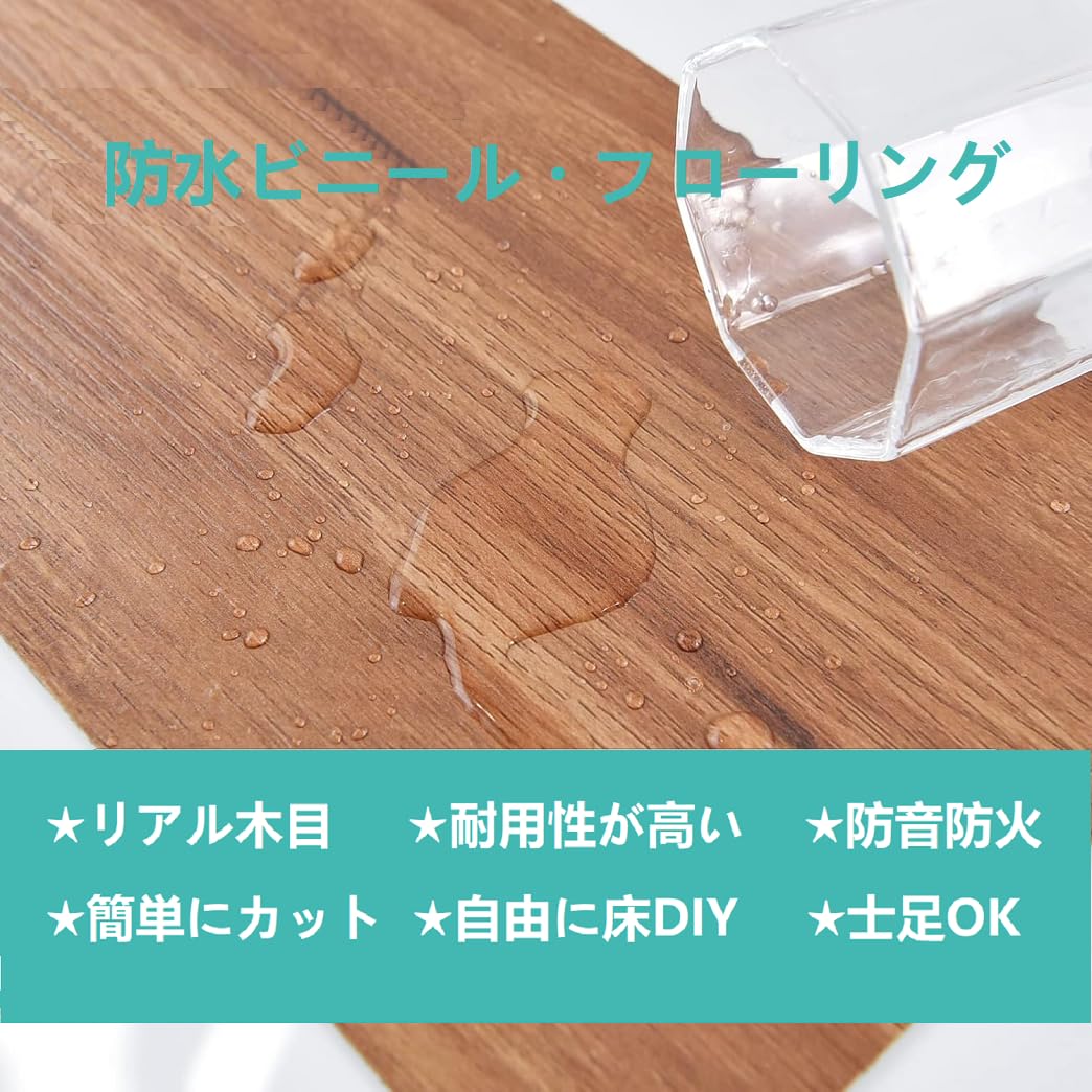 [防水性・耐久性]フロアタイル表面には耐久性に優れた特殊クリア加工・抗菌加工に加え、防水、表面についた汚れは濡れ雑巾などでふき取ってください。滑りにくいです。耐久性・耐摩耗性に優れており、土足や家具の移動でもキズが付きにくい。