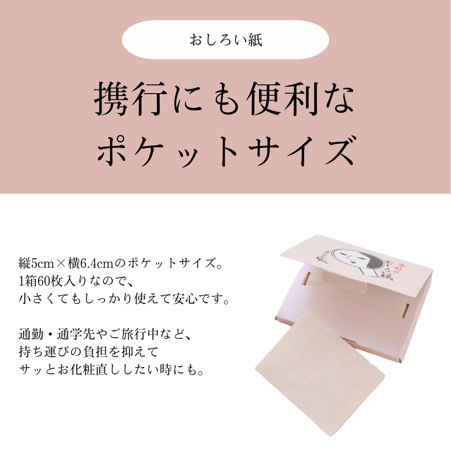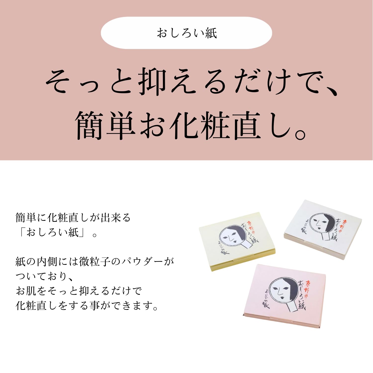 肌のあぶら浮きや化粧崩れが気になった際に、おしろい紙を肌にそっと抑えるだけで簡単にお化粧直しができます。