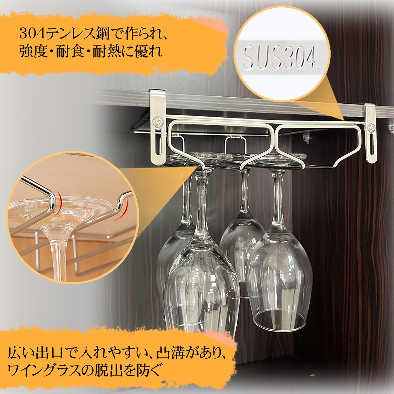ワイングラスホルダー 吊り下げ ステンレス製 穴あけ不要 棚厚さによって調節可能 (2レーン)