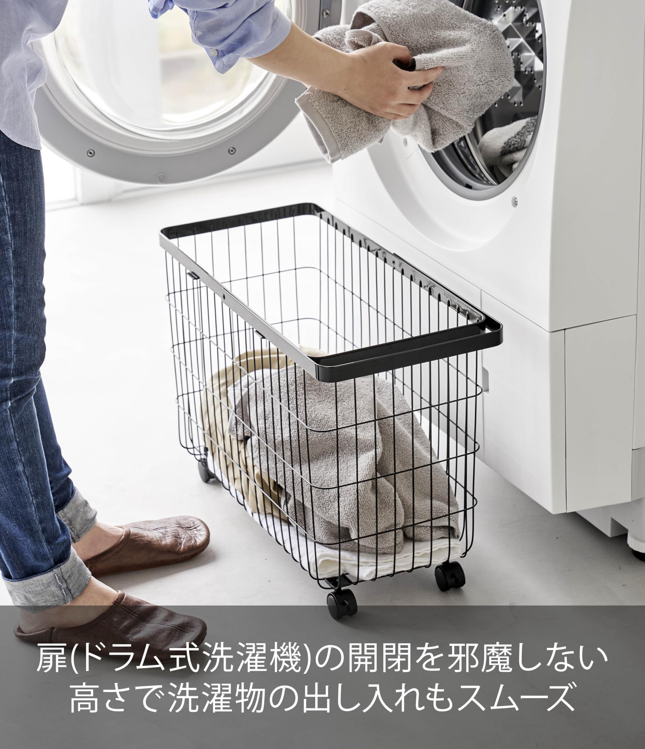 洗濯機の幅に合うワイドなキャスター付きランドリーバスケット。