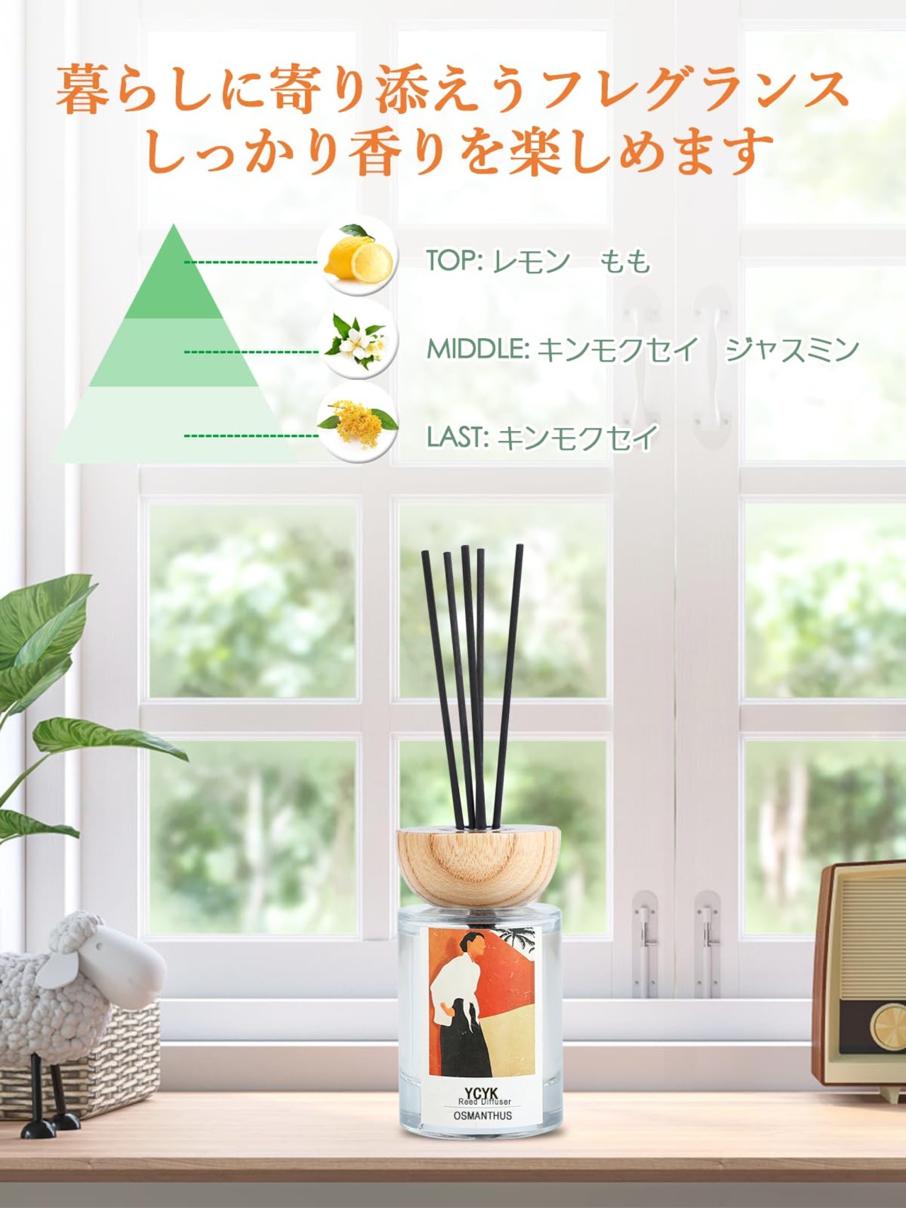 【本物の金木犀に近い香りを再現】再現することが非常に難しいとされる金木犀の香り。ディフューザー本物に近いやさしい香りなので 、強い香りが苦手な方でも 使っていただきやすくなっております。香水と同じ、高品質な香料を配合してます。季節の香りを、いつでもお家でお楽しみいただけます。