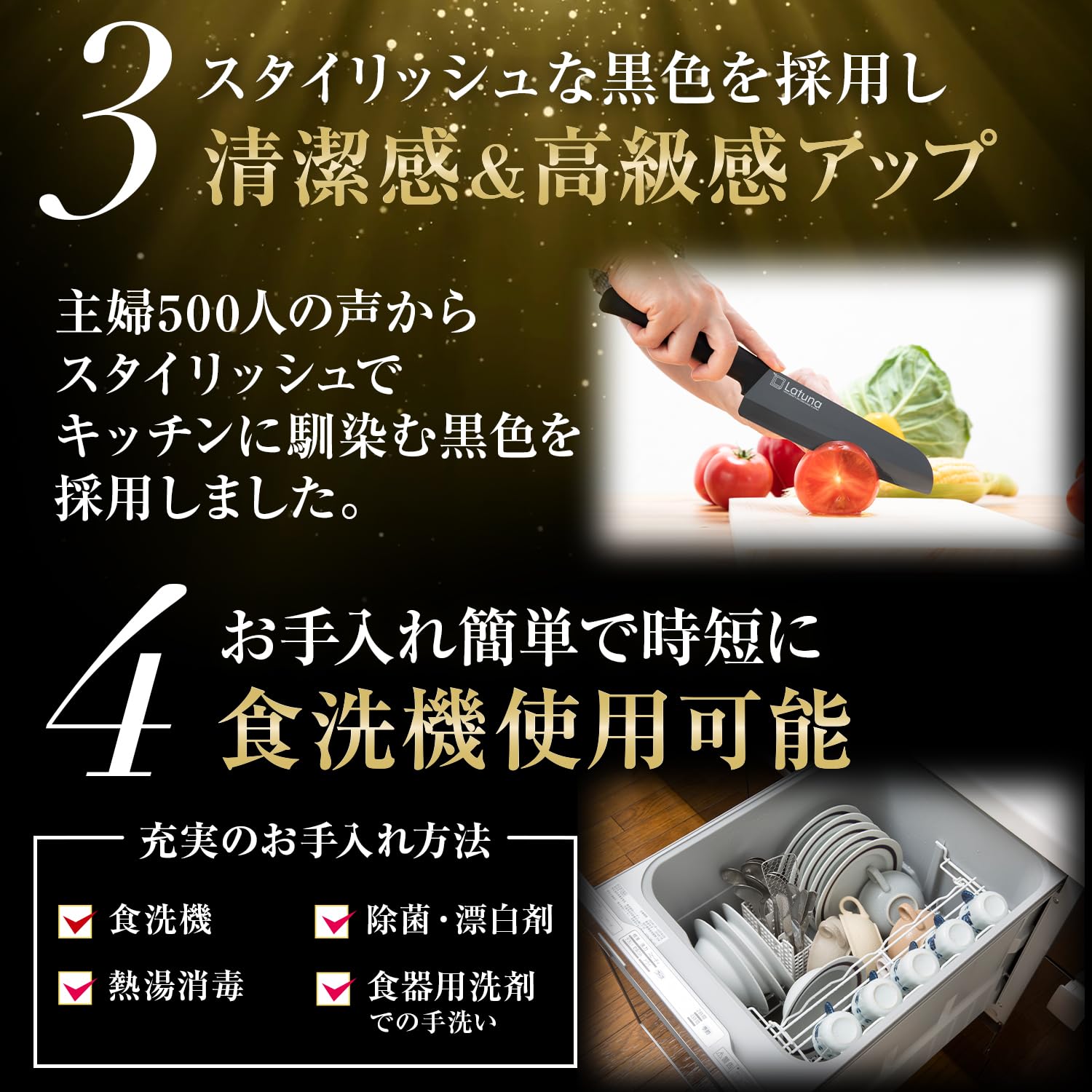 【お手入れラクラクで衛生的】普通のセラミック包丁は食洗機が使えないものが多いですが、こちらはしっかり対応。洗剤・漂白剤もお使いいただけるため、いつでも衛生的にお使いいただけます。また、ステンレスにありがちな「金属臭さ」がうつらないのも当商品の特徴です。セラミックは「錆びない」のも嬉しいポイント。持ち手には抗菌材を混ぜることで、調理中に色んなところを触り、菌が繁殖するリスクを回避します。