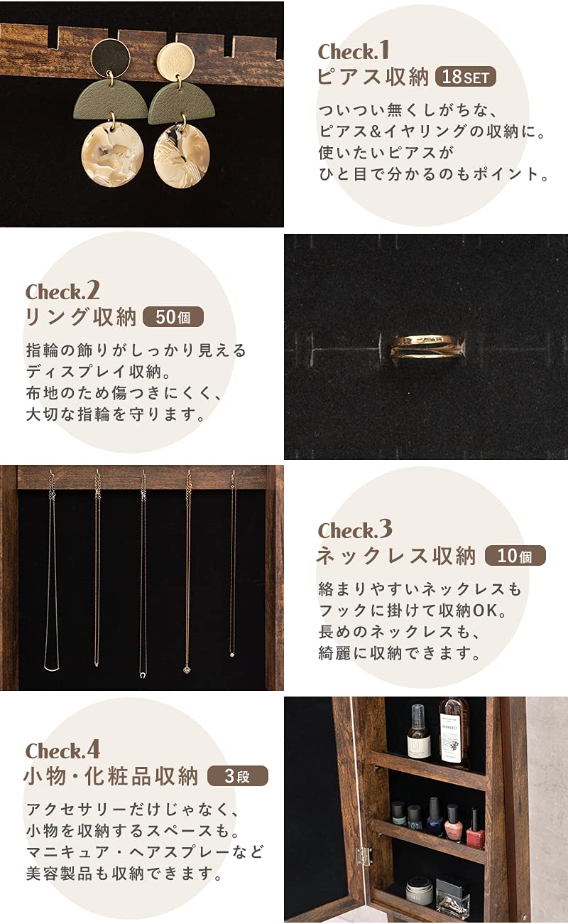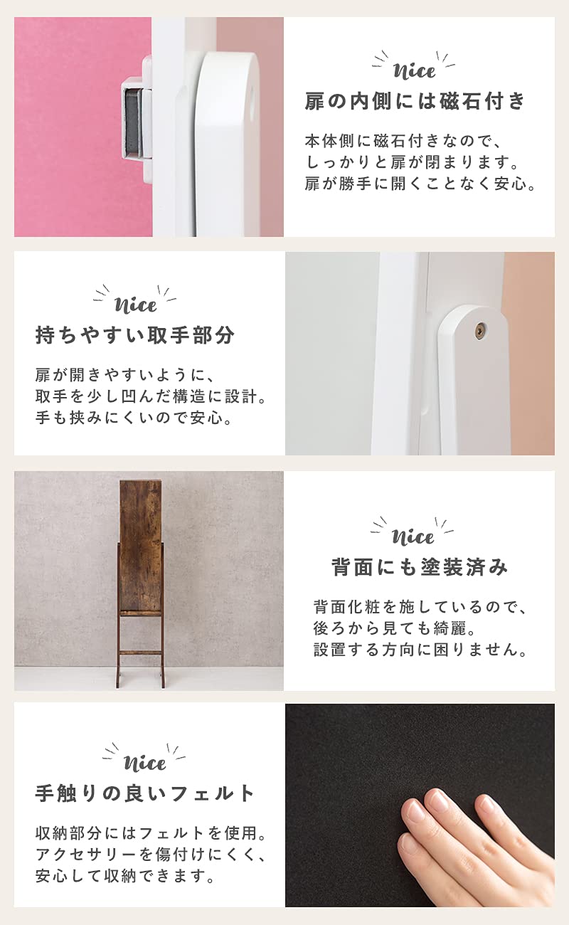 【ミラーの裏に隠して収納】 リングやピアス、ネックレスなどのアクセサリーが収納できるドレッサーの役割と、全身を映し身嗜みを整えるためのスタンドミラーとしての役割をどちらもこなします。