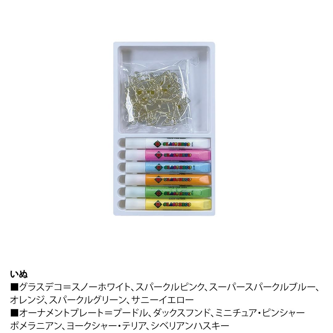【特長】 付属の透明プレートにお好きな色のグラスデコを塗って乾かす(約8時間)だけでカラフルできれいなオーナメントが簡単に作れ、塗り絵感覚で楽しめます。 いぬのオーナメント6種が入ったセットになります。
