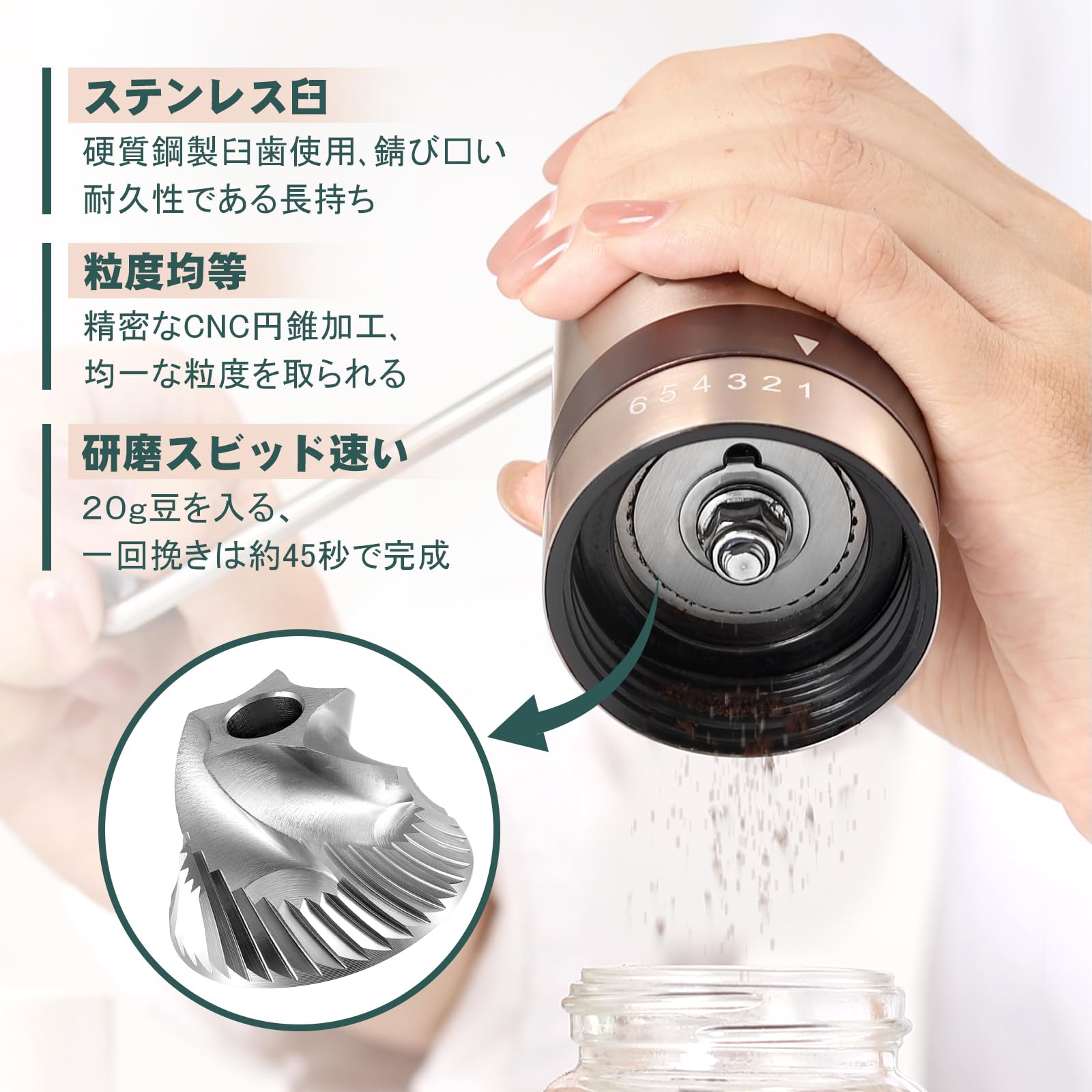 【優れた研削速度】 珈琲ミルのホッパーに約20g豆を入る、一回挽きは約45秒で完成、研削速度はセラミックバリよりもはるかに高速です。いつでも新鮮なカフェを味わいが楽しめ,心から豊かな広がりもたらします。