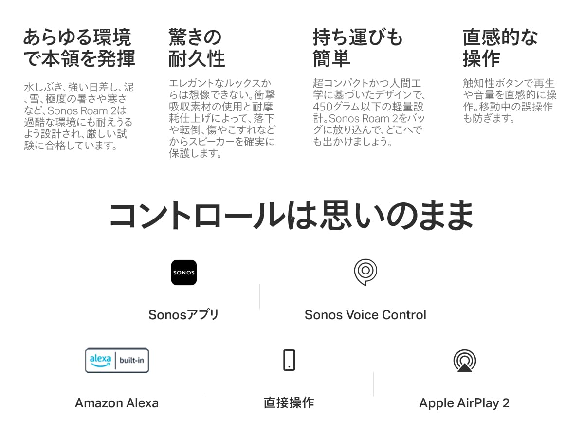 Roamの最新モデル。Wi-Fi、Bluetoothが利用可能。防滴、耐衝撃設計。1回の充電で最長10時間連続再生。2台でステレオペアも可能。