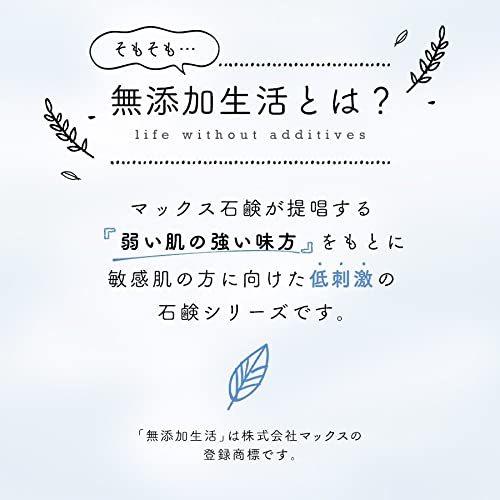 【安心・安全な無添加】マックス石鹸が提唱する「弱いお肌の強い味方」をもとに、敏感肌の方に向けた低刺激のシリーズ。成分表示に敏感な方にもオススメな無添加処方です[香料、着色料、パラベン 不使用]