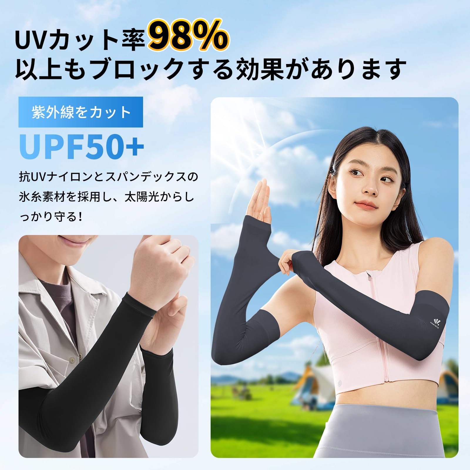【業界最高級のUVカット98%&UPF50+】このアームカバーは、抗紫外線効果のある錦綸(ポリアミド)と氨綿(スパンデックス)のアイスシルク素材を使用しています。98%以上の紫外線を遮断し、UPF50+の高い防紫外線性能を誇り、腕を紫外線の影響と日焼けから最大限に守ります。夏に短袖で外出する際も、この腕 カバー日焼けを心配する必要がありません。