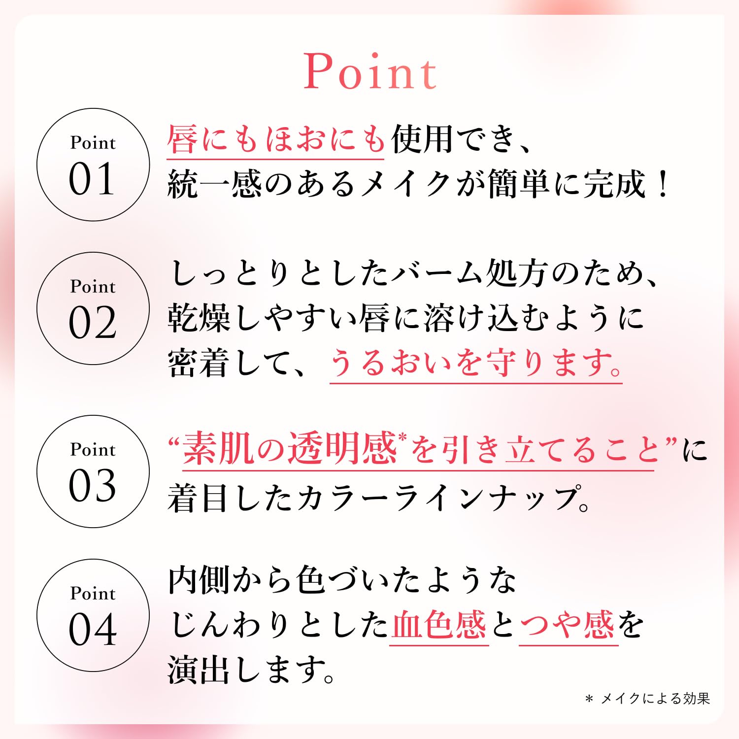 ●【しっとりした使用感】しっとりバーム処方で、唇・ほおのうるおいを守ります。なめらかにのびて、乾燥しやすい唇にも溶け込むように密着するのに、べたつきのない使い心地です。