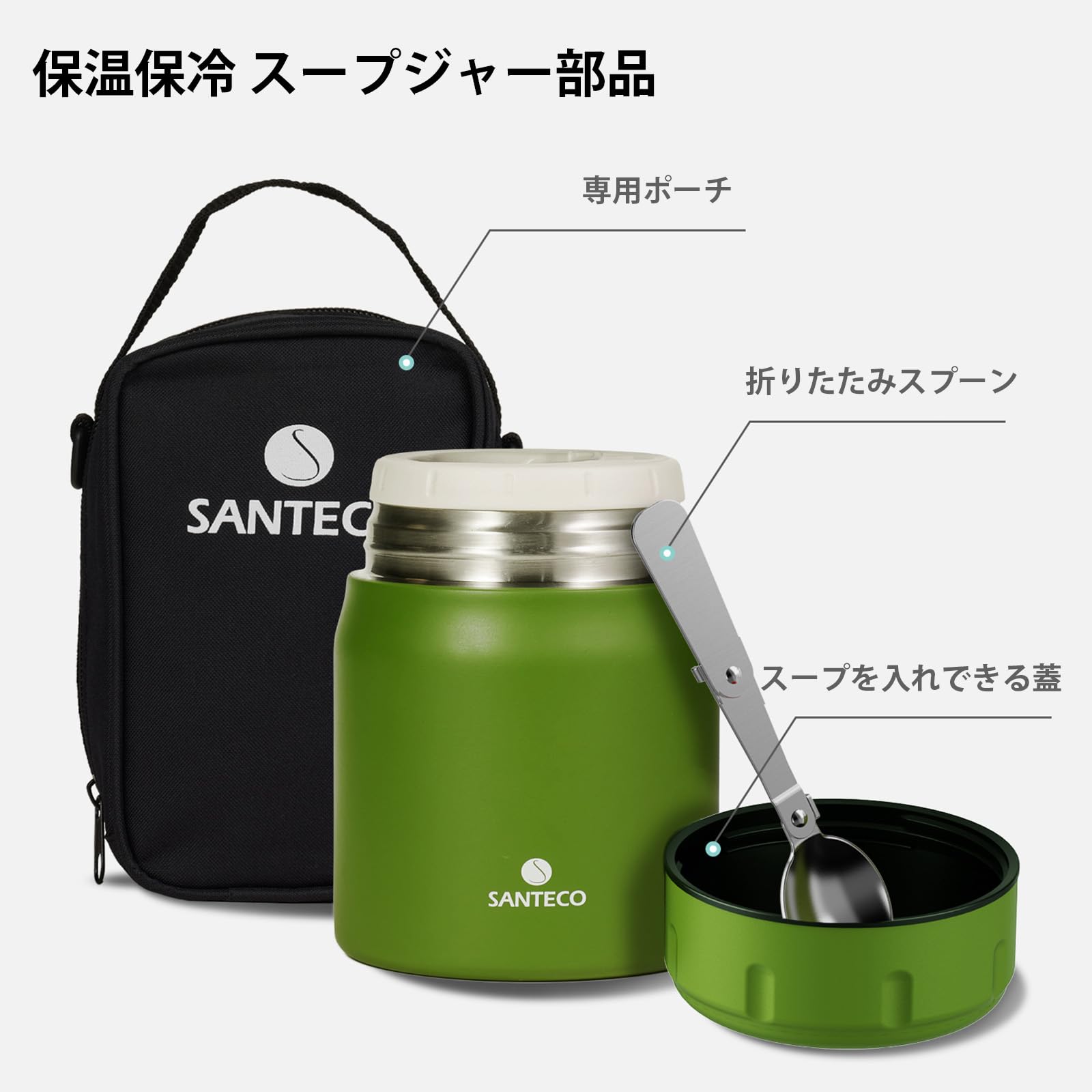 SANTECO ステンレス 保温 スープジャー 真空断熱 500ml 広口 保温保冷 ランチジャー 保温弁当箱 スプーン バッグ付 お手入れ簡単 NERA グリーン
